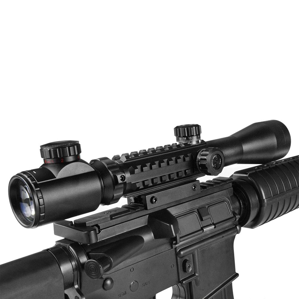 This tactical rifle scope is well suited for mid to long range shooting, with high optical clarity at 3-9X times magnification and a 40mm objective diameter. The reticle is illuminated in red or green and in multiple brightness intensities, for a suitable sight picture regardless of lighting or environment. The integrated 20mm tri-rail provide ample space for attaching multiple accessories.