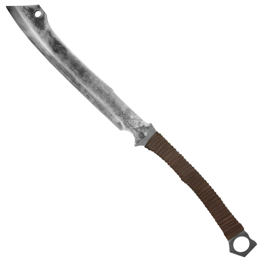 Warrior, as you head into battle, you know that you have prepared and are ready for taking on the enemy. You wield the Manganese Steel Cleaver Sword. Made from manganese steel, this functional sword features a single-edged blade. It has a cleaver-like shape and a forged finish. There is a hole at the tip near the spine. This part of the spine is taller than the rest of the blade.