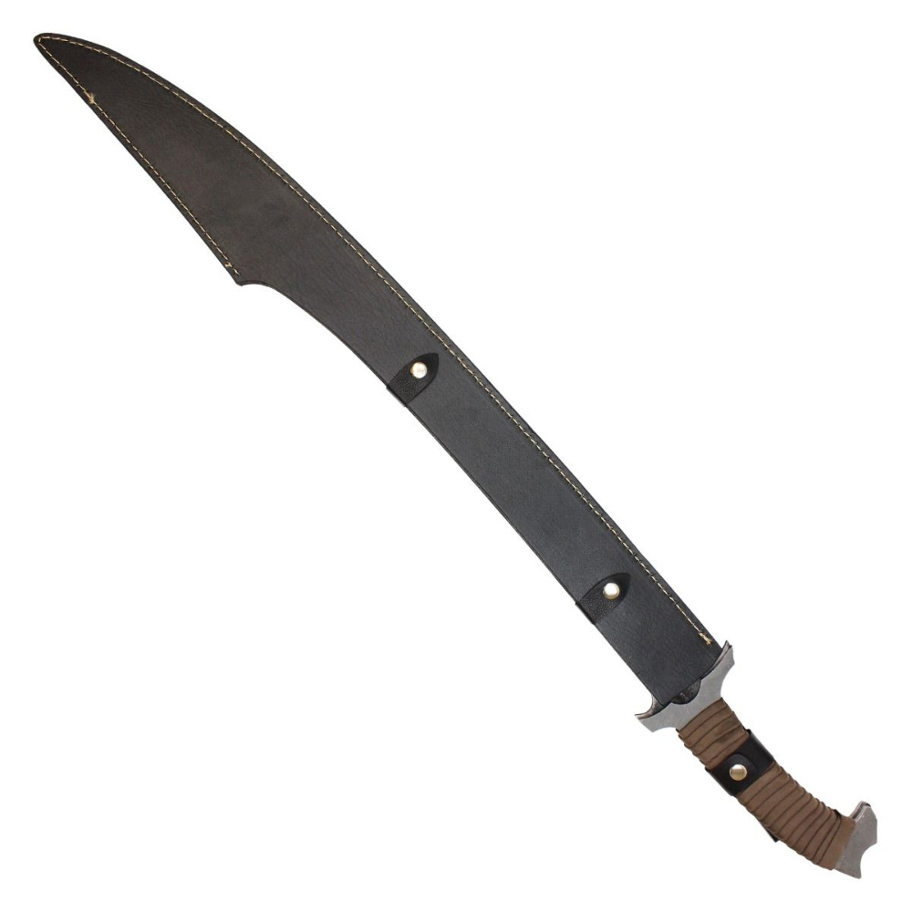Finally, this scimitar sword comes with a leather scabbard. The black scabbard secures the sword in place with snap straps. It has a shoulder carrying strap. This sword is functional for historical reenactments. It looks great added to a weaponry collection.