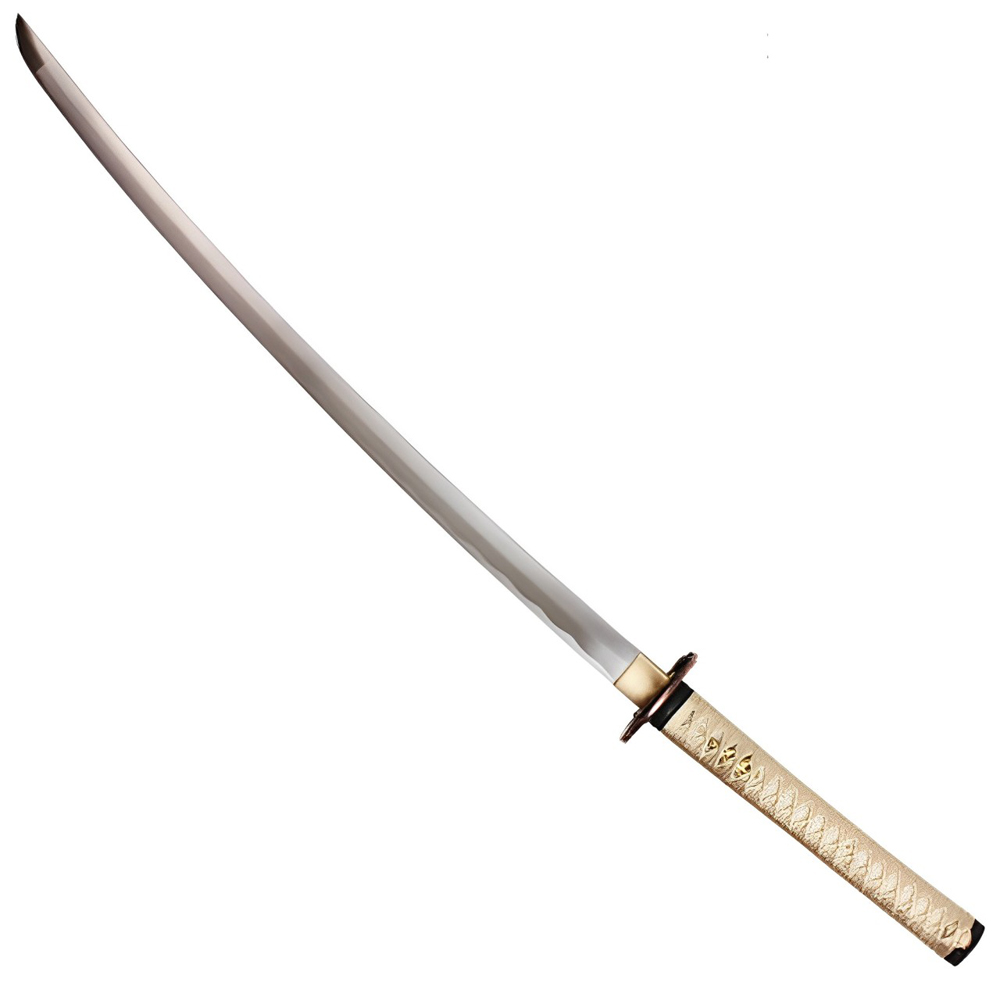 With a striking 41.25" Overall Length, this Handmade Gold Katana boasts a gleaming 1045 Carbon Steel Blade that combines Strength with Aesthetic Appeal. The Ray Skin Wrapped Handle ensures Superior Grip and adds a touch of Elegance. Perfect for Display or Practice, this Katana includes a Sword Bag for Safe Storage and a Certificate of Authenticity, solidifying its status as an authentic Piece of Japanese-inspired Craftsmanship.