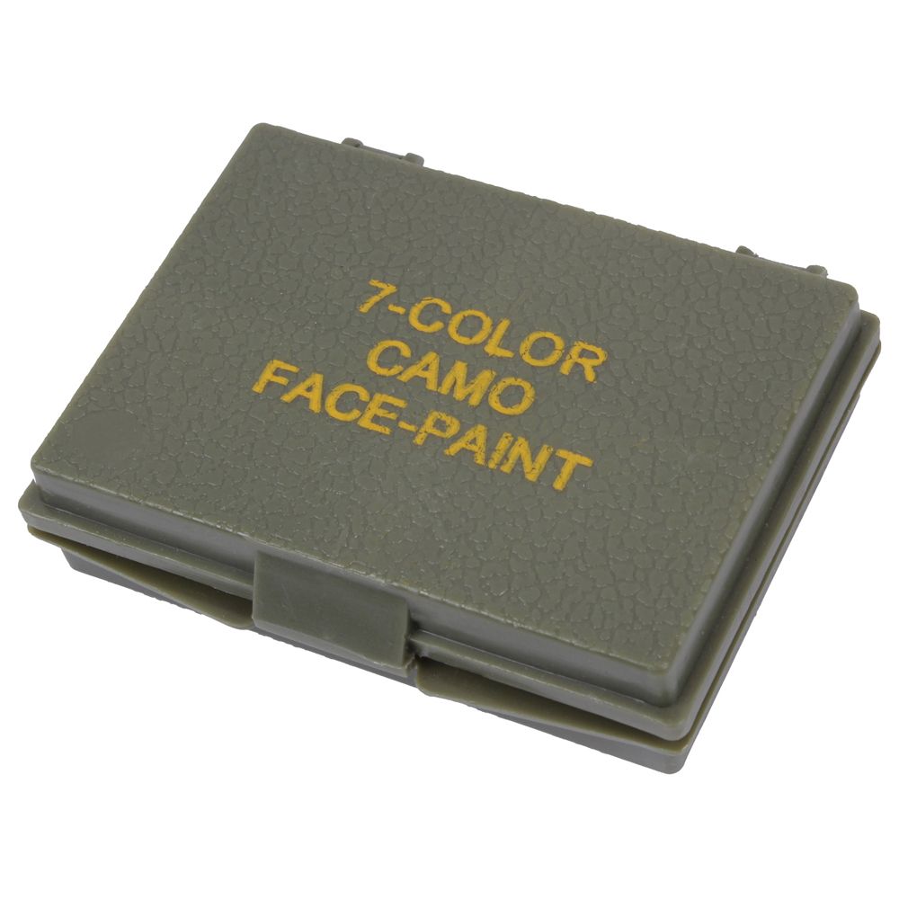 7 Color Camo Face Paint Compact comes with light green, grey, olive drab, black, sand, foliage, and loam colors in a plastic case. Contains lanolin oil and mineral oil; no nut oils used.