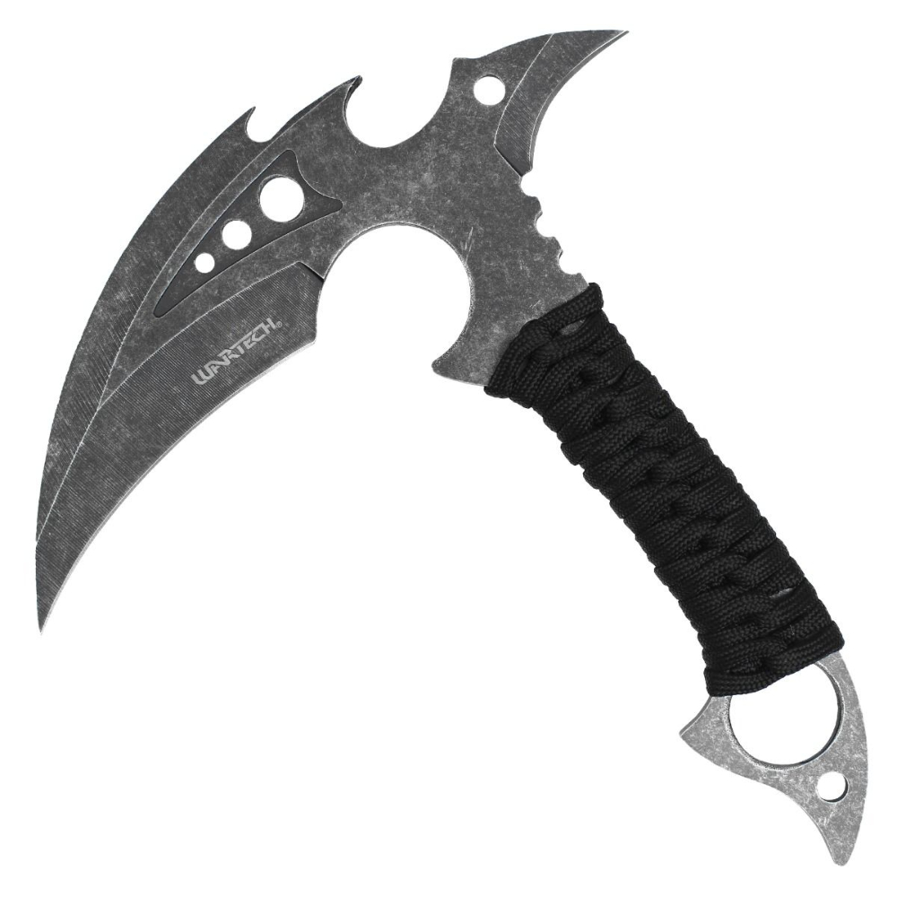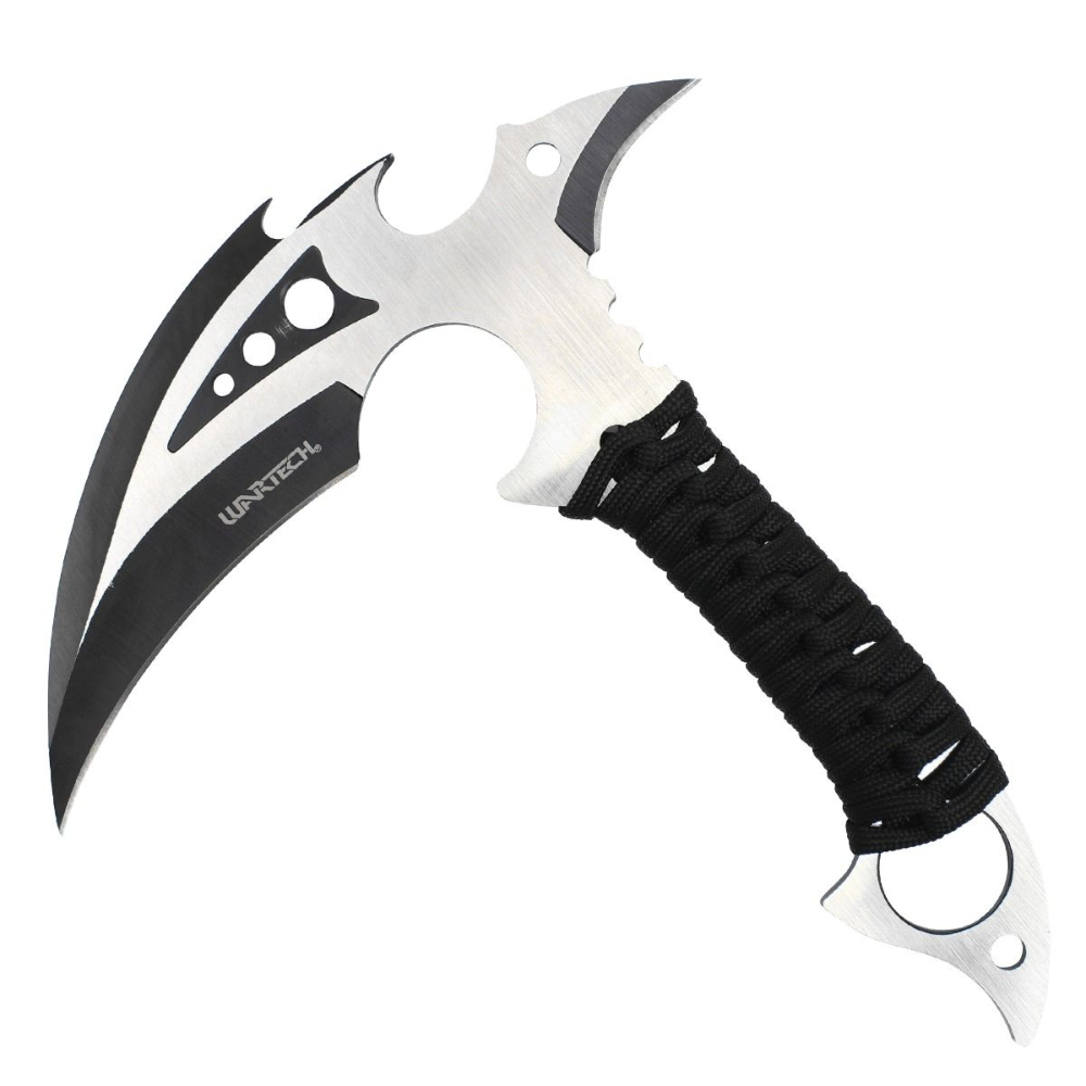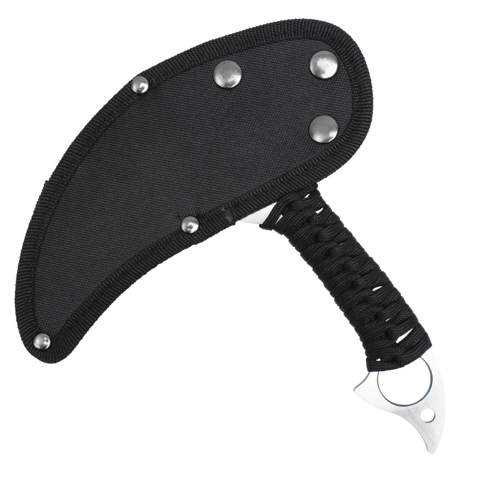 Meanwhile, the axe features a curved, claw-like blade. There is a matching spike on the opposite side of the axe head. There are deep concave curves at the base of the blade before the spike. In addition, there are cutout circles on the axe blade and spike. Finally, this axe comes with a black nylon sheath. Add this tactical axe to your outdoor gear. It works well for a variety of scenarios.