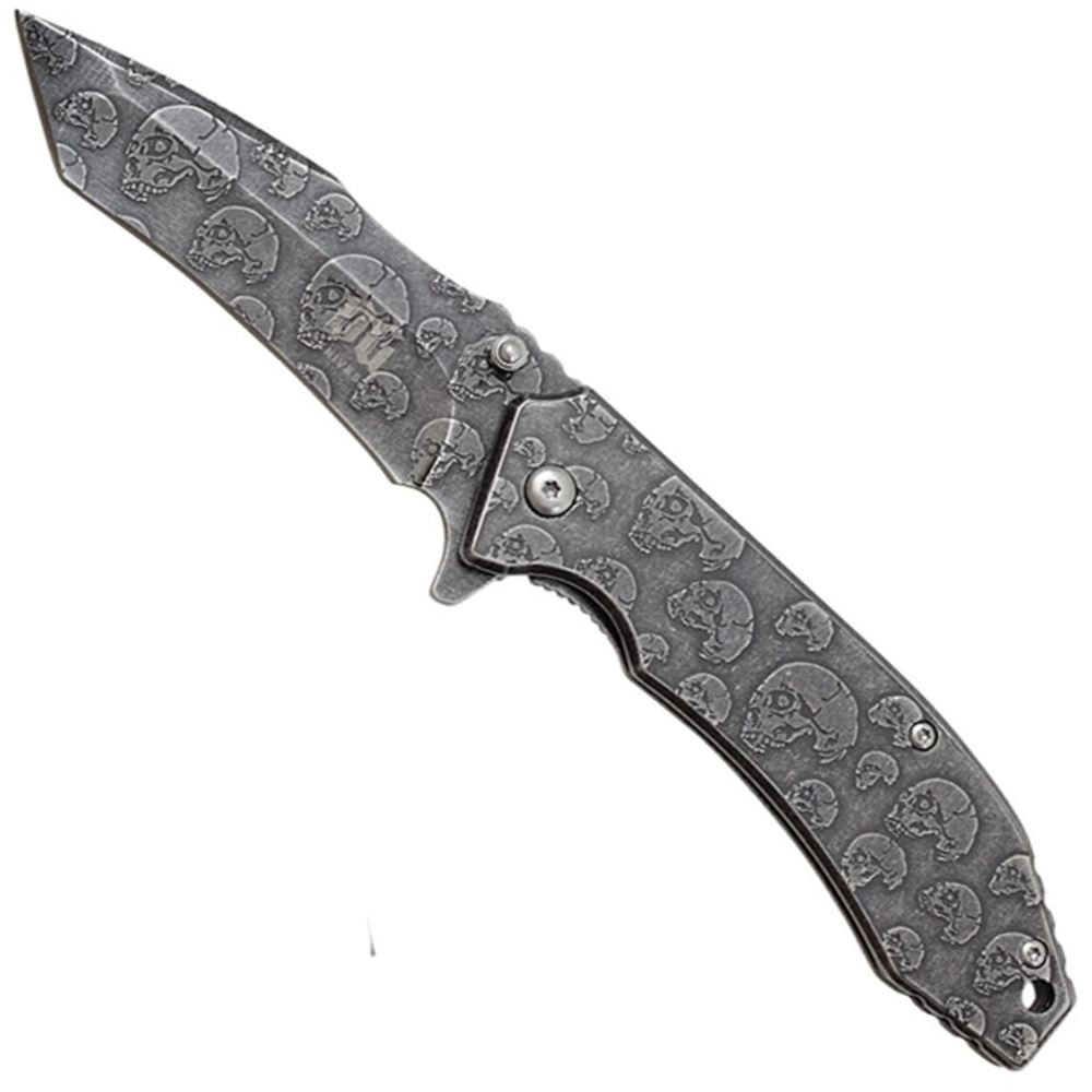 OG knives 8" Stonewashed Folding Knife with SKULL DESIGN HANDLE. EDC knife with potable and convenience belt clip design easy to clip on your belt or backpack.Practical and Elegant Gift-You can use it for camping, hiking, travel, survival, climbing, law enforcement and any outdoor activity, as well as general use and daily cutting housework