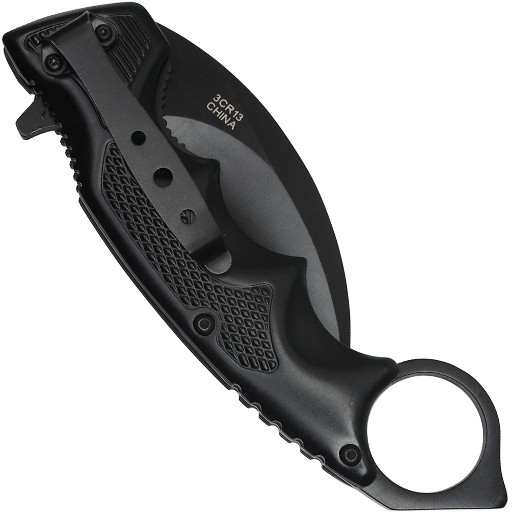 The 8.5" Black Pocket Karambit is a compact and formidable folding knife designed for law enforcement and tactical applications. With its sleek black finish, it exudes a discreet and professional appearance. The karambit-style blade, measuring 8.5 inches in length, is crafted from high-quality stainless steel, providing exceptional sharpness and durability. The ergonomic handle is designed for a secure and comfortable grip, allowing for precise control and swift maneuvers. The folding design enables convenient and discreet carry in your pocket or bag. Whether you're a law enforcement professional, a tactical enthusiast, or someone prioritizing personal safety, the 8.5" Black Pocket Karambit offers a reliable and versatile tool for law enforcement and tactical situations.