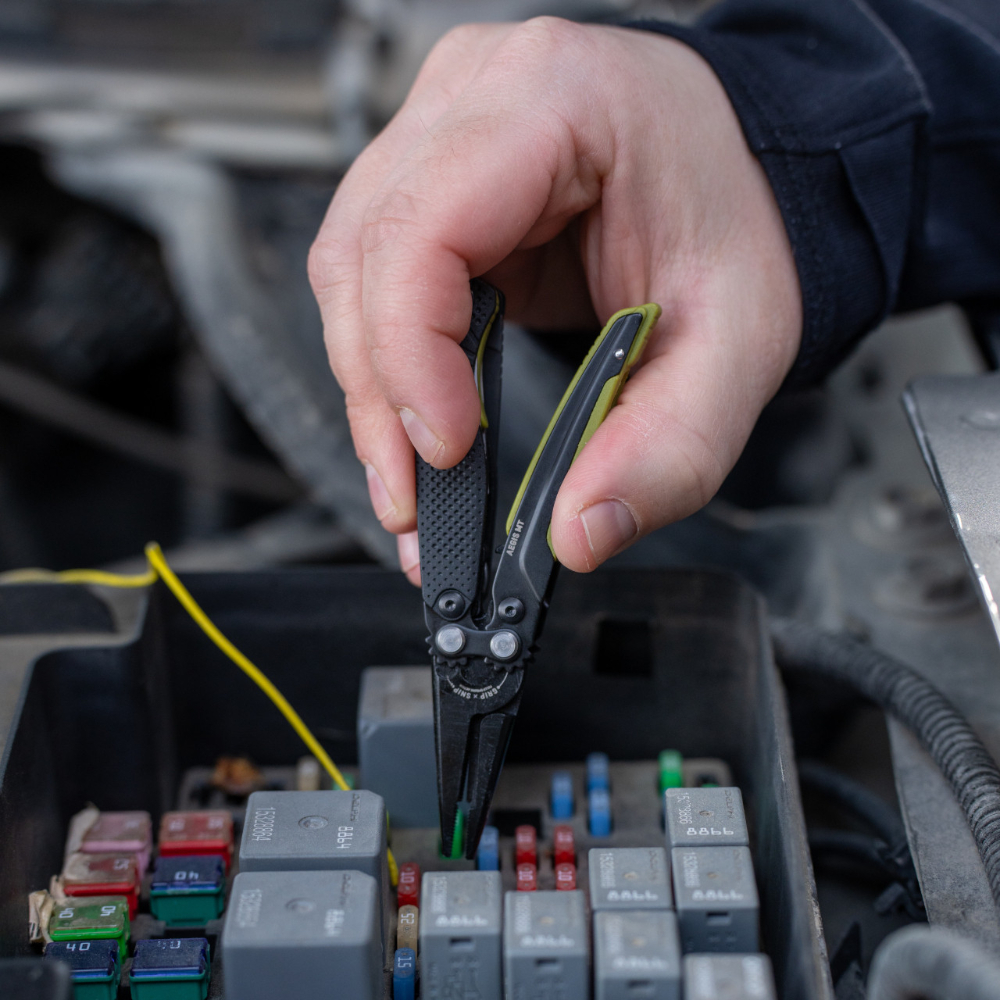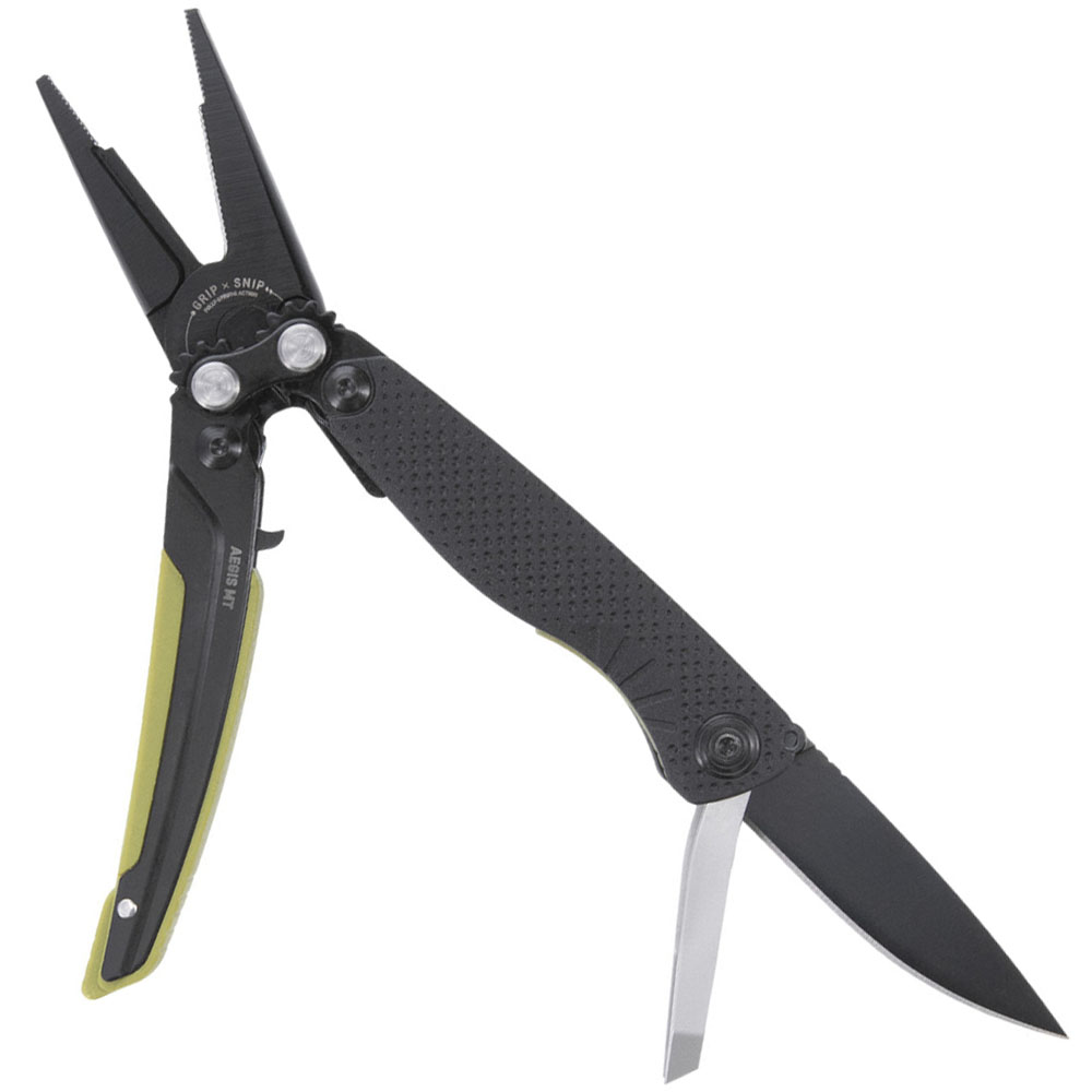 Featuring an ambidextrous design with a tough GRN ergonomic handle and a grip pattern designed for outdoor use with or without gloves, wet or dry. The sharp CRYO 440 stainless steel clip point blade works for a variety of cutting chores while providing excellent edge retention and resistance to corrosion. Aegis MT holds five essential tools including needle nose pliers with SOG's patented Compound Leverage, a soft wire cutter, tweezers, bottle opener, and a 1.9 inch 440 stainless steel clip point blade.