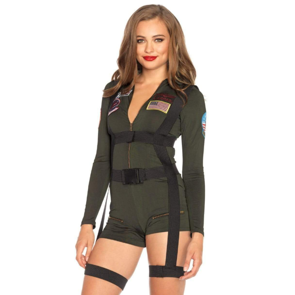 Feel the need for speed in this sexy 2 PC Top Gun Costume Romper Flight Suit by Leg Avenue. This iconic licensed womens Halloween costume features a spandex zipper front romper flight suit with zipper pocket detail, movie patch accents, velcro body harness, and interchangeable Maverick and Goose name badges.