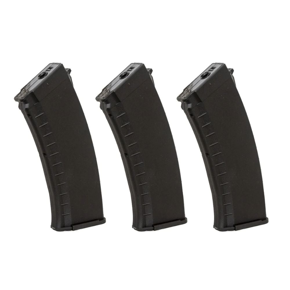 Now available in a convenient 3-pack, the new AKR ERG/AEG 3 30/60 mag has the ability to change capacities from 30 to 60 rounds, allowing the user to train with a realistic round count, or to dominate the airsoft field. These mags fits all current and future AKR Series ERGs and AEG 3, and feature a new, user-friendly capacity switch on the bottom of the magazine.