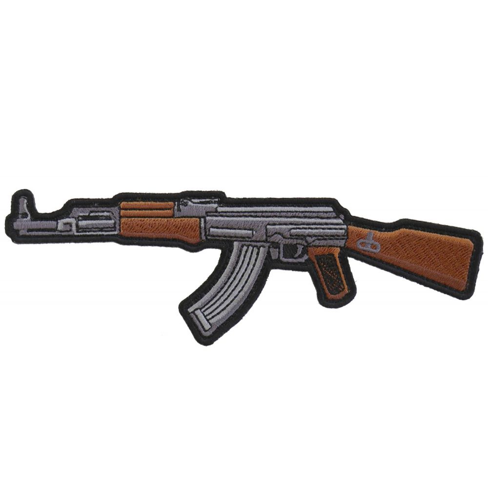 AK-47 Patch is embroidered in brown, black and two tones of gray. The patch measures 6x2 inches. Has two different versions, one pointing left and one pointing right. (See related products for different versions)