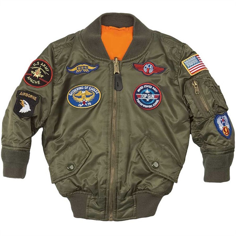 Our kids MA 1 has a look both military personnel and civilian kids will love: a sage green nylon shell, emergency orange lining, and an assortment of authentic flight patches