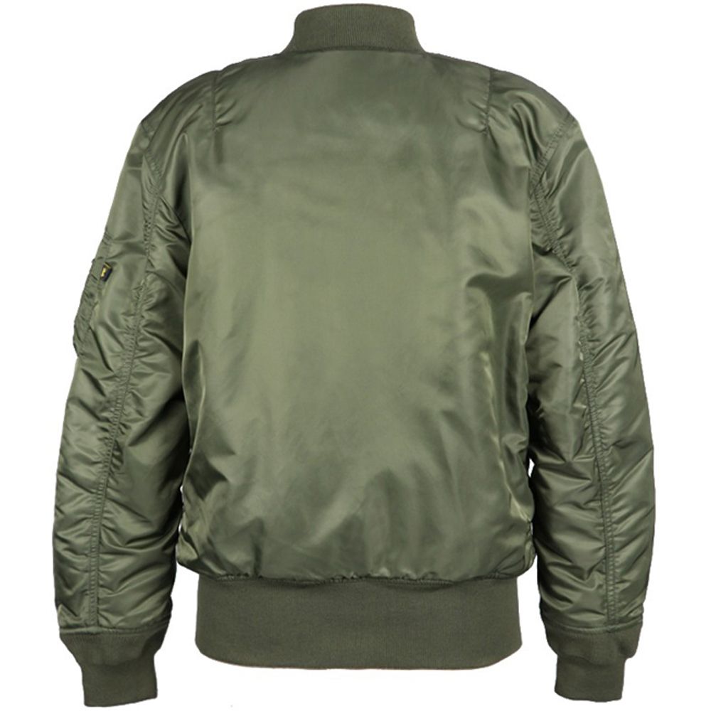 The flight jacket has a durable metal zipper with Alpha branding and logo.