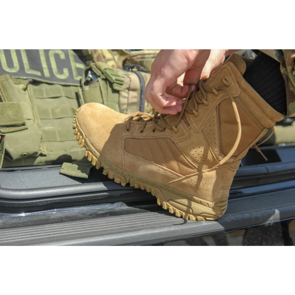 Step into the ultimate blend of Comfort and Performance with the Altama Foxhound SR 8″ Combat Boots. Built for the toughest missions, these Boots feature a Removable EVA Insole with PORON® Cushioning for Exceptional Support, while the Custom-Molded Phylon EVA Midsole ensures Lightweight Comfort. The Airport-Friendly Nylon Shank offers Stability, and the Durable Polymer Speed Lace Eyelets make adjustments effortless. Topped with a Slip-Resistant Carbon Rubber Outsole, these Boots Exceed Industry Standards for Traction and Safety. Whether on Duty or Adventure, these Tactical Boots are your go-to for Peak Performance. Get your Pair Now!