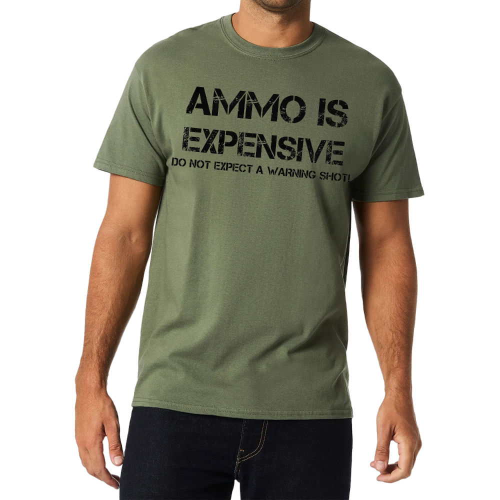Show your love for firearms with our Round T-Shirt in two stylish colors, classic white and earthy olive drab. Featuring a witty 'Ammo is expensive' design, this shirt adds a touch of humor to your wardrobe while highlighting your passion. Choose your color and wear your firearm enthusiasm proudly.