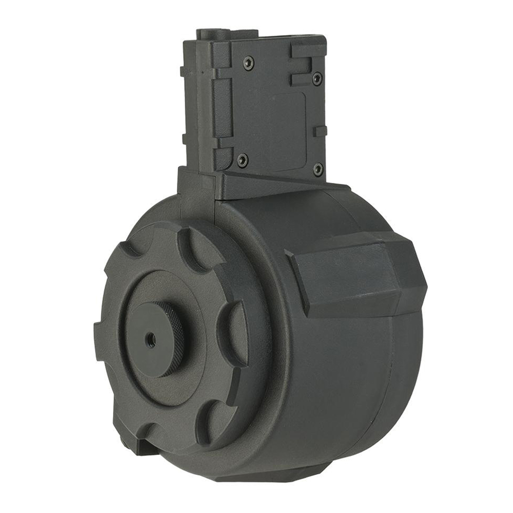 The Angel Custom Firestorm Drum magazine represents the pinnacle of research and development in the search for a compact, reliable, high capacity Airsoft magazine. The Firestorm takes the high capacity capability of popular electric winding drum magazines and replaces the jamming prone electric motors with the popular operator manipulated flashmag mechanism improving the overall reliability and feeding capability of the magazine. Unlike most other high capacity drum style magazines on the market, the Firestorm is not tied to a single weapon platform. Angel Custom offers the adapters for the firestorm separate, allowing for it to be used in M4/M16, AK and G36 style Airsoft AEGs, one magazine, three different weapon types. Compact in design, lightweight in construction and devastating in capacity, the Firestorm provides the ability to offer SAW style suppressive fire without SAW size and weight.