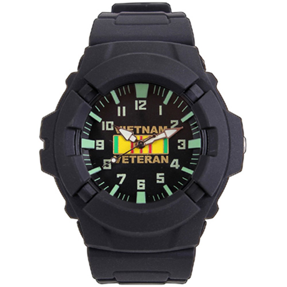 The Vietnam Veteran Watch from Aqua Force features quartz Japanese movement, luminous hour markers, is water resistant up to 50 meters, and has a rubber adjustable wrist strap. The watch comes in a plastic display case and comes with a 2 year manufacturers warranty.