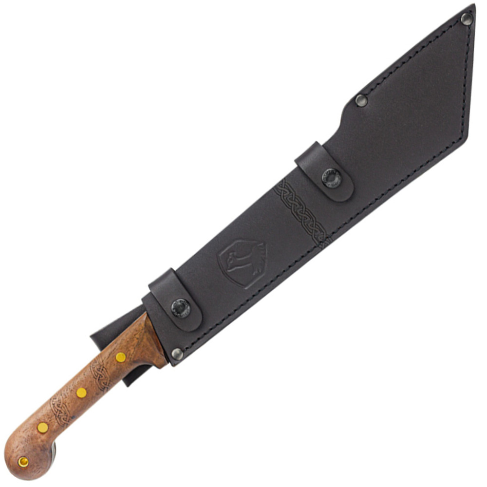 "With its sizable tanto 1075 blade, the Argyll excels in tackling tough wilderness duties, effortlessly managing everything from chopping and clearing to precise cutting. Crafted from resilient walnut wood, its handle offers remarkable durability, ensuring a secure grip even after extensive use. Additionally, it comes with a convenient brown leather sheath featuring a belt loop for effortless transportation.