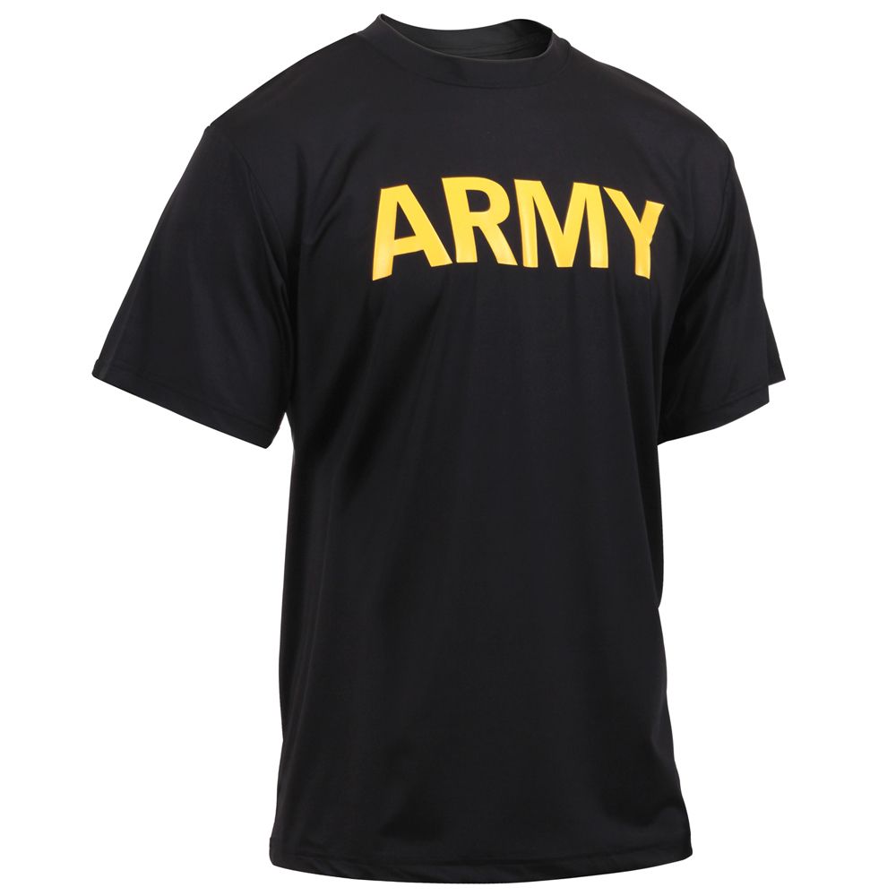 Lightweight and Comfortable. Ultra Force's Army PT Shirt is a new and improved version of the traditional military physical training uniforms. Ultra Force's PT Shirt is constructed of a Nylon/Spandex performance material that is breathable and moisture wicking. Gold "ARMY" lettering is printed across the chest. Complete the uniform with Ultra Force's matching Army PT Shorts!