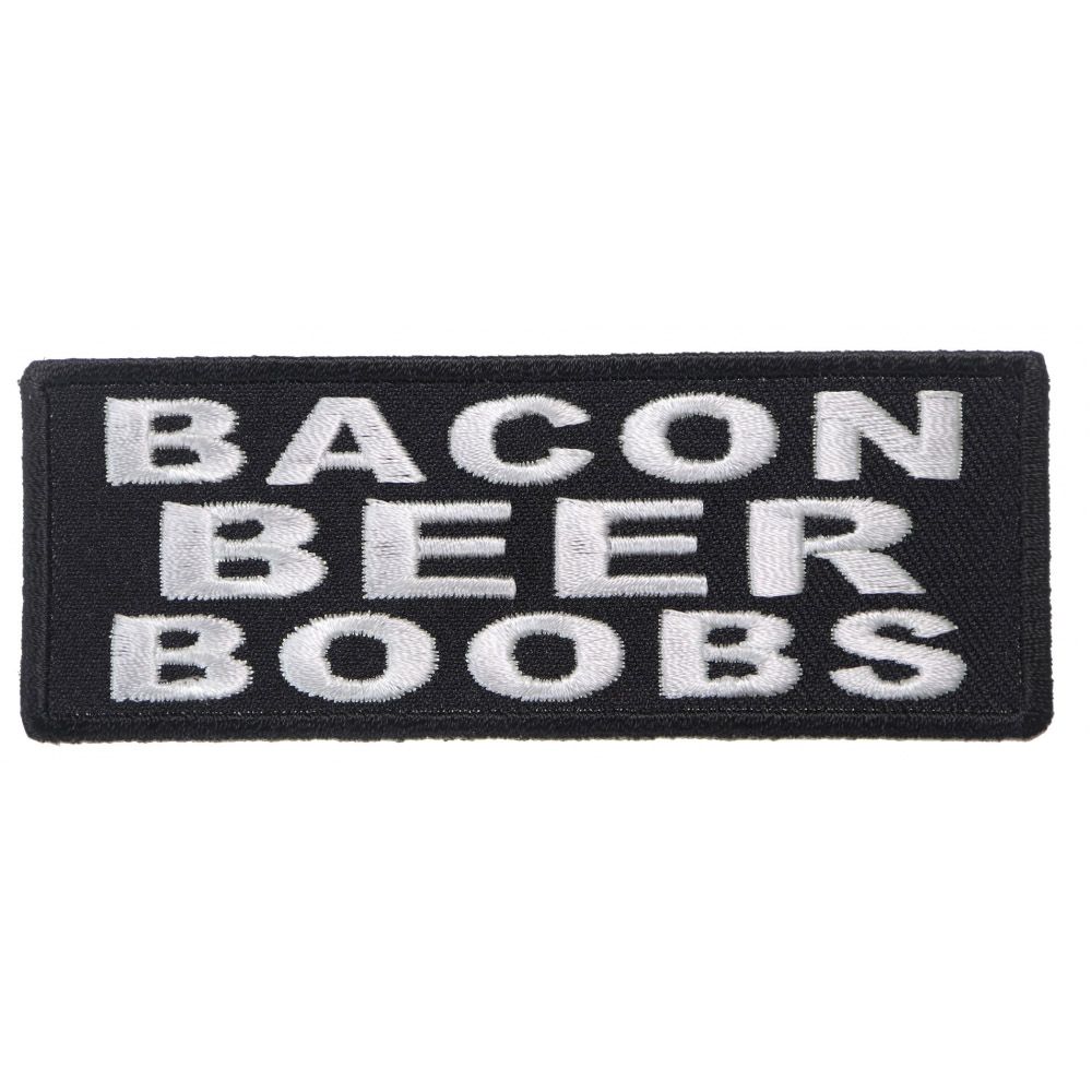 Bacon Beer Boobs Patch measures 4x1.5 inches and is Embroidered in Black / White. The Small Patch can be sewn on or ironed on to clothing such as Denim or Leather Jackets, Vests, Hats, Back Packs, Shirts. Features plastic backing and embroidered die cut borders.