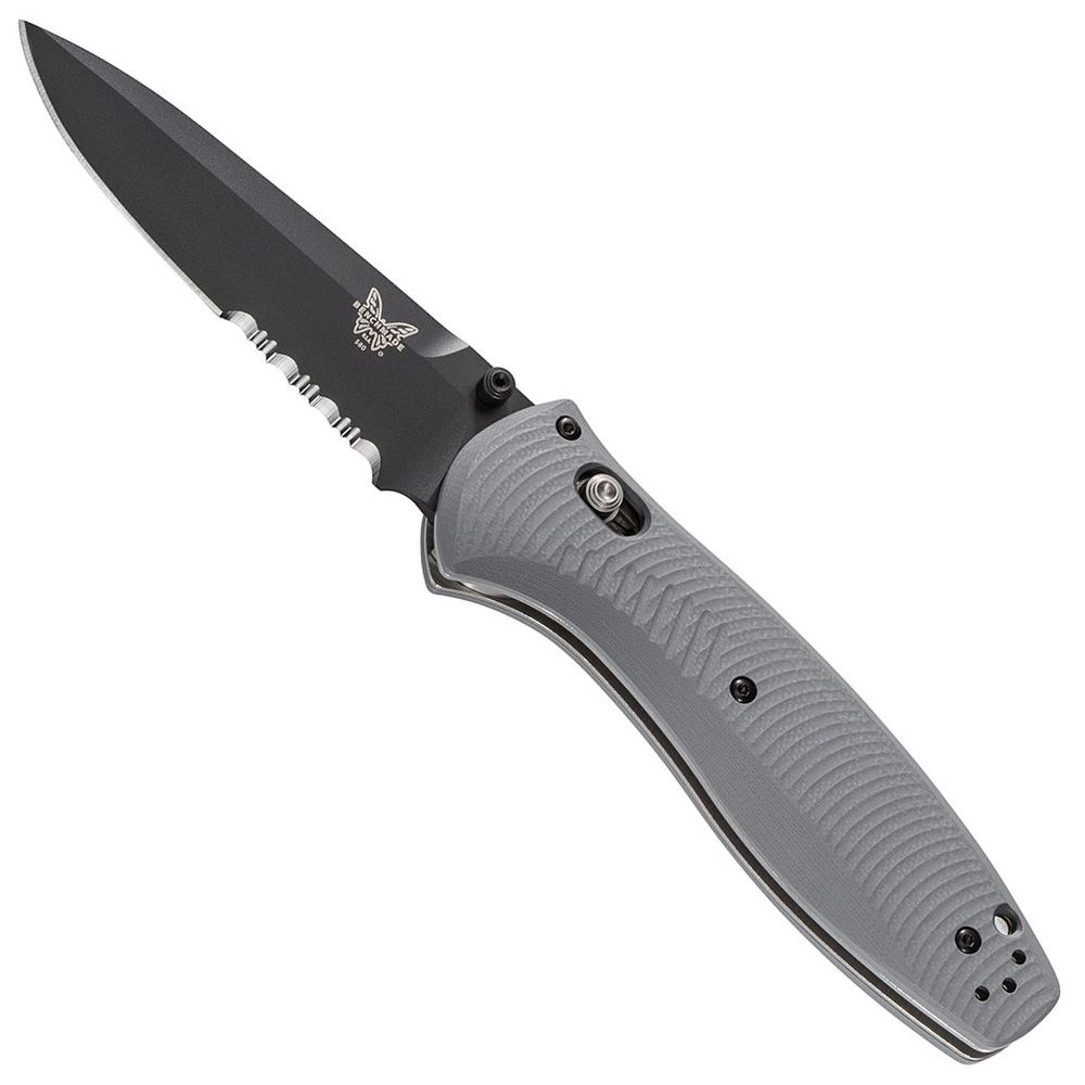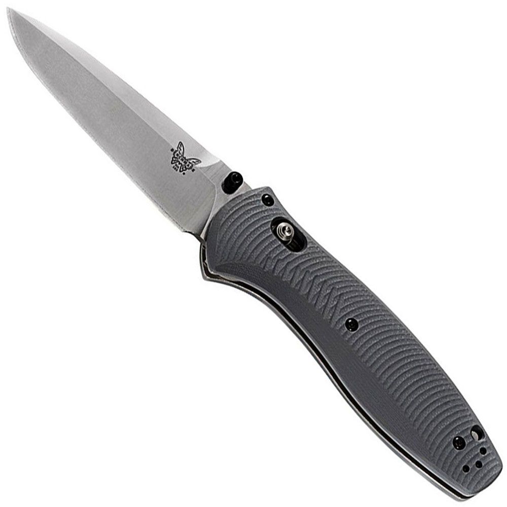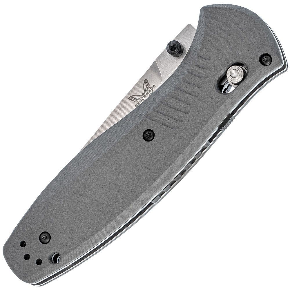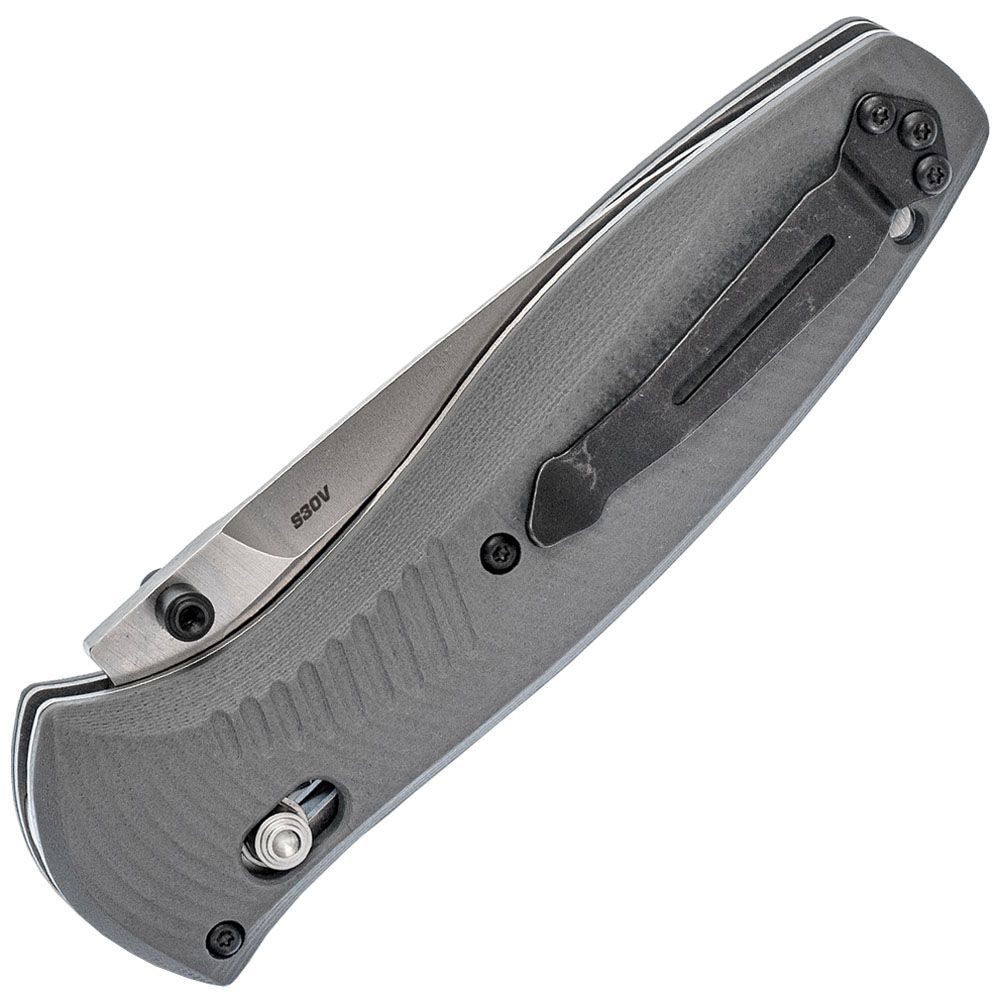 The Benchmade Barrage Knife has top of the line features from its blade down to its handle. The blade is made of CPM-S30V stainless steel, one of the best tool steels due to its hardness and corrosion resistance. The new cool-grey G-10 handle is extremely durable, but offers a modern and sleek look.