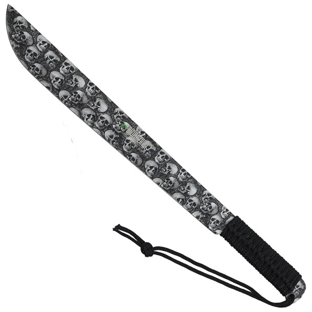 An awesome Machete with skulls designed all over it. It has a trailing point blade with a perfectly angled curve geometry for forwarding and downward cuts. Perhaps this looks like a collector's piece, however, it is built to be used for anything. The ultimate apocalypse survivor would be complete only with a dedicated machete like this one. This machete comes with a tough nylon sheath and belt loop.