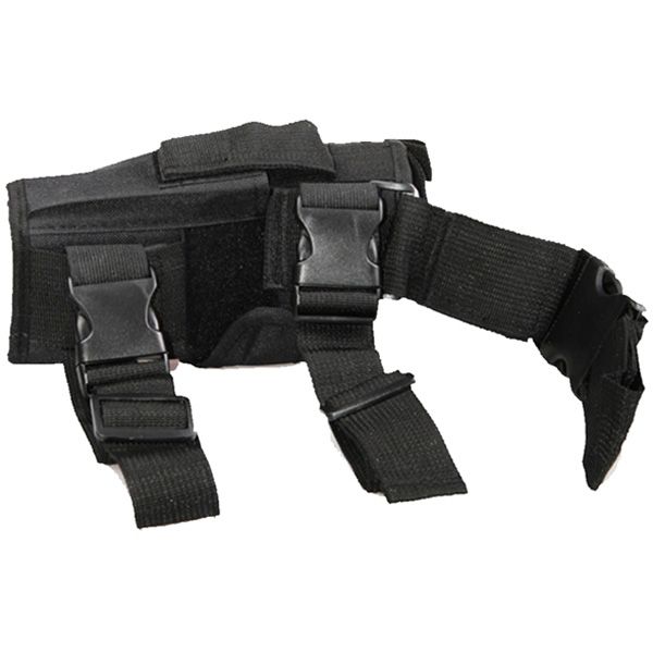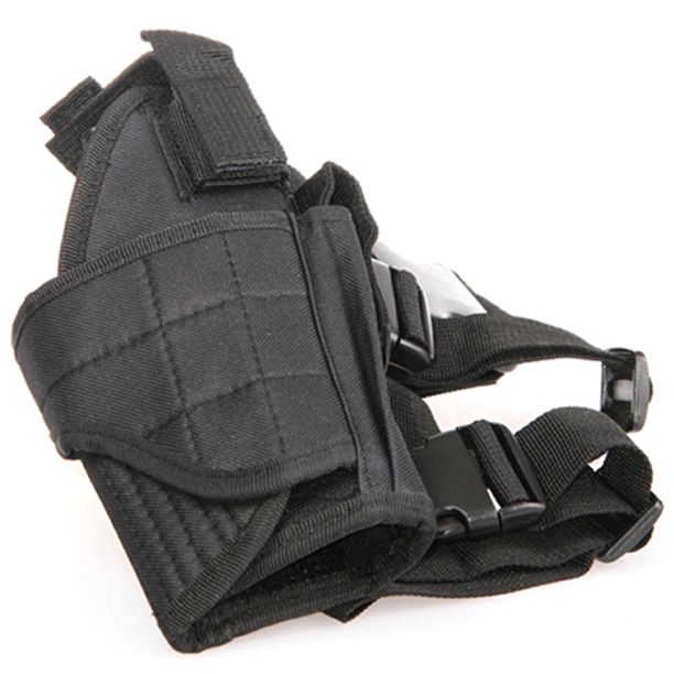 This Tornado holster has adjustable velcro so you can adjust it according to the type of pistol you have. It is made for a beretta but can fit a glock, 1911, P226, and much more. The adjustable velcro enables you to strap your gun super tight or a little loose depending on how much of a tight fit you want. It also has a small outer pocket, perfect for a short mag or a pocket knife for when you go camping. It has a vertical attachment that goes around your belt and then 2 horizontal clips that wrap around the leg for a secure fit.