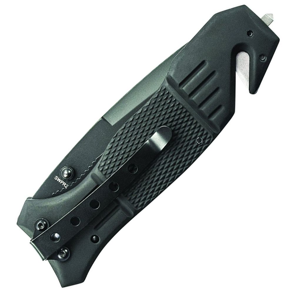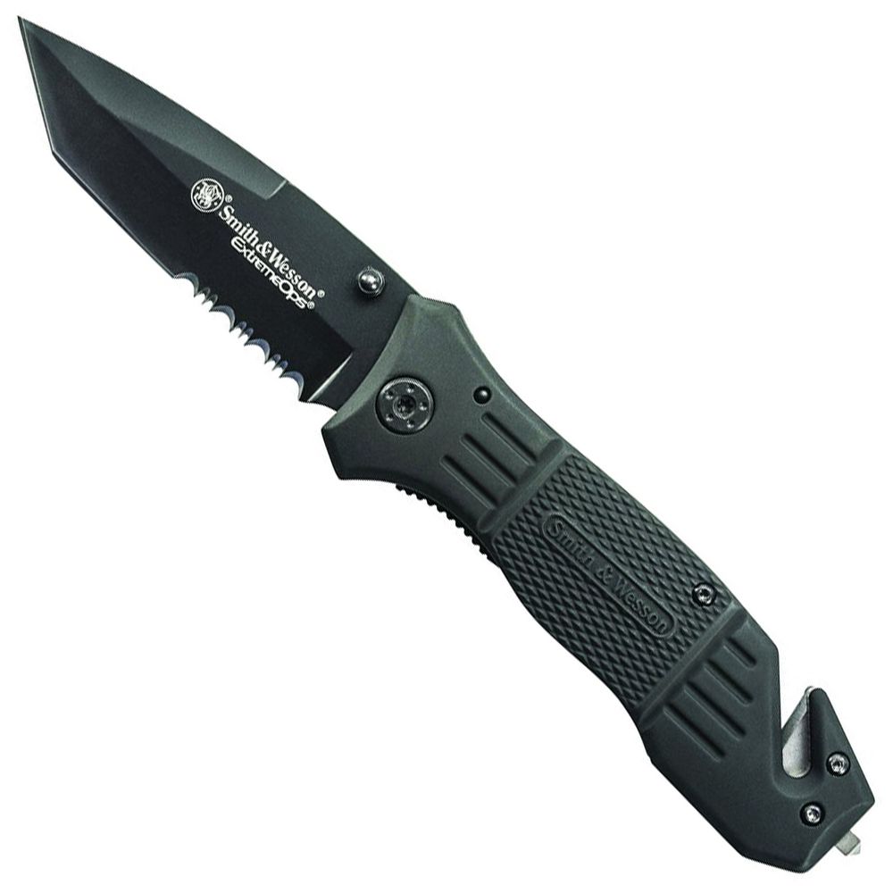 Smith & Wesson Extreme Ops Liner Lock Folding Knife, Black 7Cr17 High Carbon Stainless Steel Partially Serrated Drop Point Tanto Blade with Ambidextrous Thumb Knobs, Textured & Grooved Black Aluminum Handle with Glass Break, Strap Cutter, and Pocket Clip