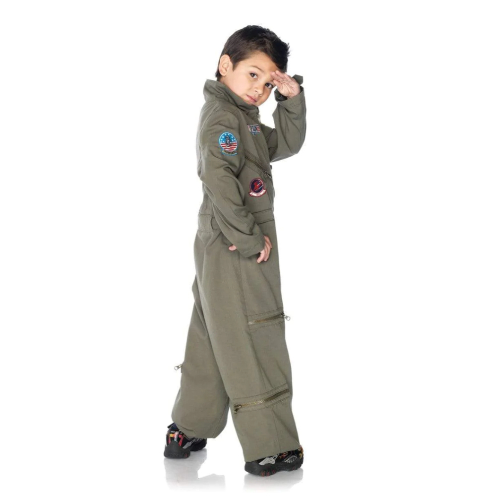 Feel the need for speed in the Top Gun Costume Flight Suit by Leg Avenue. This iconic licensed boys Halloween costume features the zipper front flight suit with zipper pocket details, movie patch accents, and interchangeable Maverick and Goose name badges.