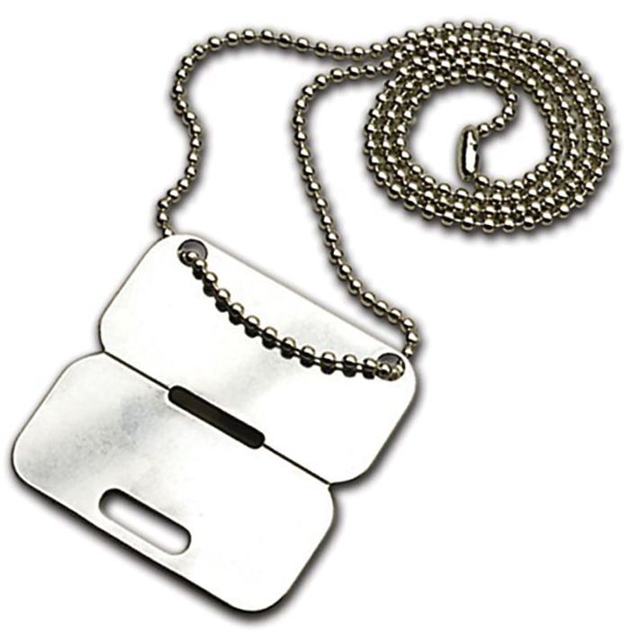 Designed as a personal information carrier for military personnel, the Canadian Army Dog Tag is also a valuable item for adventurers, athletes and tourists. The clip apart tag is designed for safety and comes with a stainless steel bead chain.