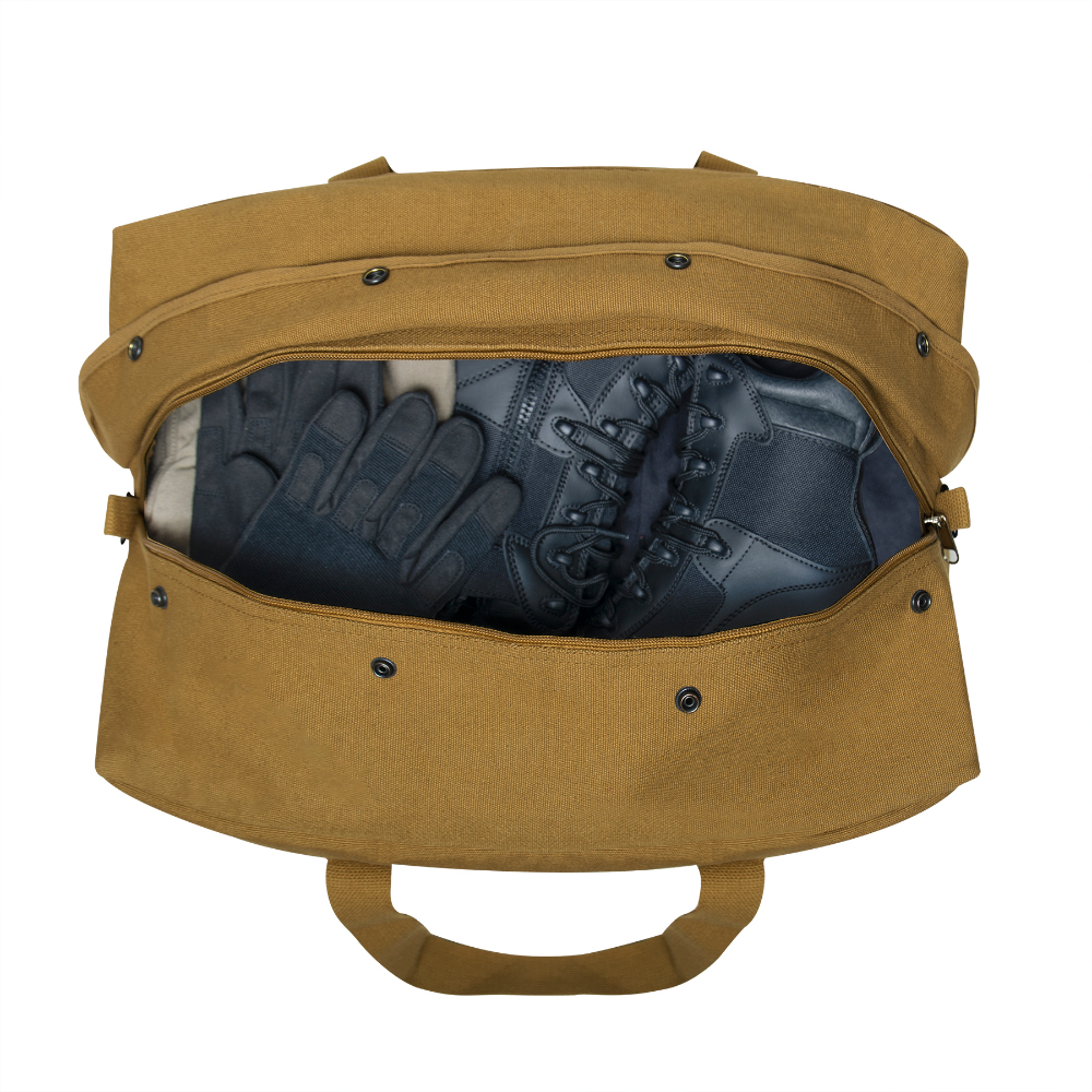 This bag is made of heavy duty cotton canvas. It is presentable, yet tough and robust; very good to carry your essentials. It comes with a snap flap and a zipper that runs the full length. The handles are strong, made of reinforced material. The size of the bag is just right to let you carry it with ease on most occasions. The look and the size are good enough for it to be allowed in flight as cabin luggage. It can be folded very neatly and carried as an extra bag for an emergency.