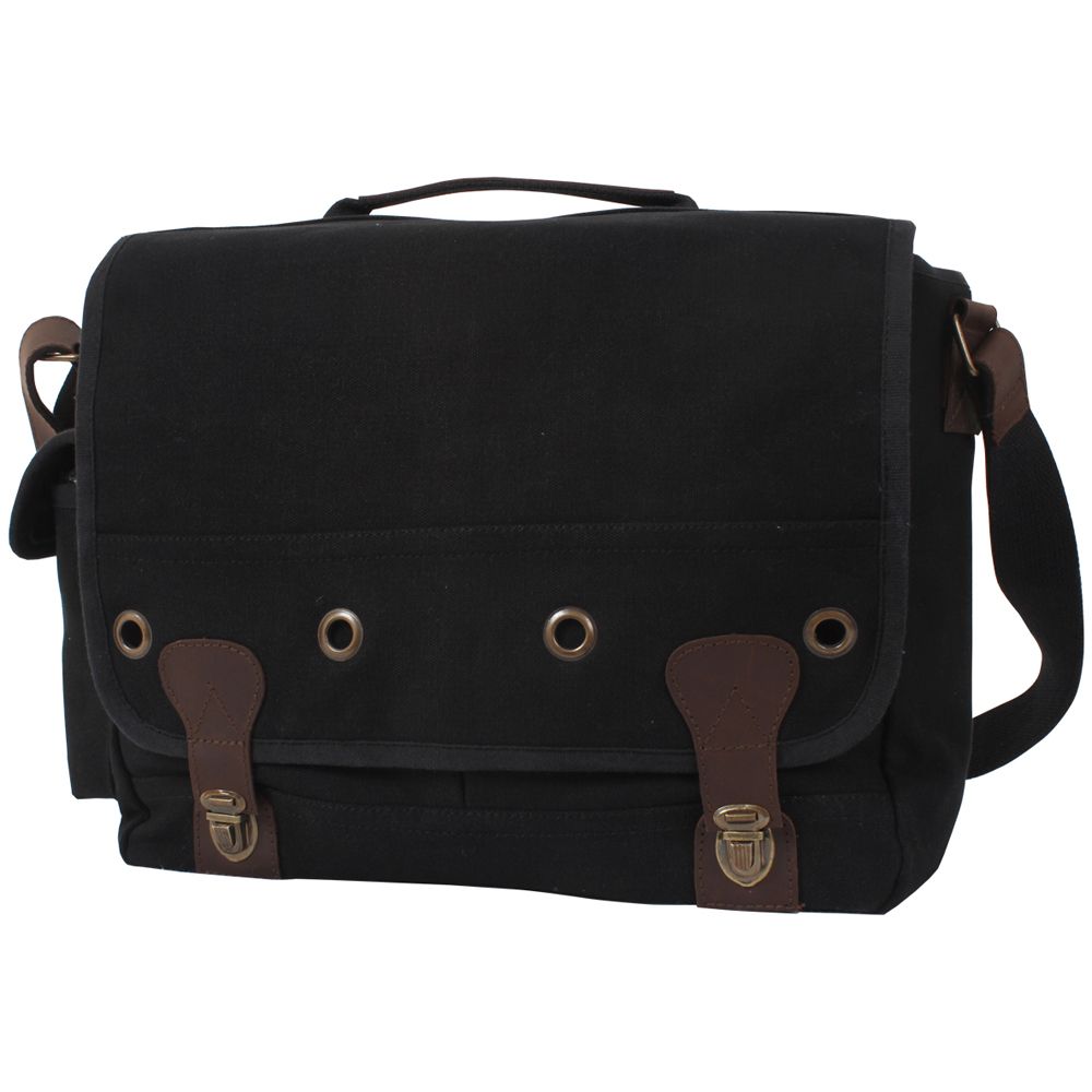 Trailblazer Laptop Bag is constructed with heavyweight washed canvas with leather accents. The front flap features 4 brass grommet accents with 2 antique brass closures. The bag has a large main compartment with an inside zippered pouch, padded sleeve with a strap for a laptop. Additionally the bag features 2 front pockets and 1 side snap pocket which are great for storing pens, pencils and other supplies.