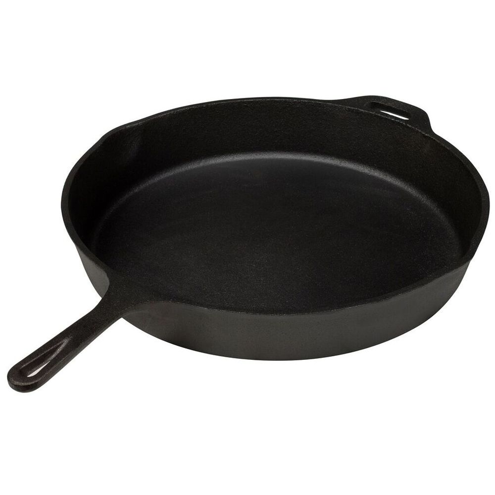 Prepare campfire treats with the Cast Iron Outfitter 15.5" Frying Pan. Big enough to feed a few people, this fry pan is your little secret to one-pan cooking. Whether you are searing, frying, or roasting in this cast iron cookware, it will deliver an excellent non-stick performance. The pan is equipped with a handle and extra carry lip for an easy grip.