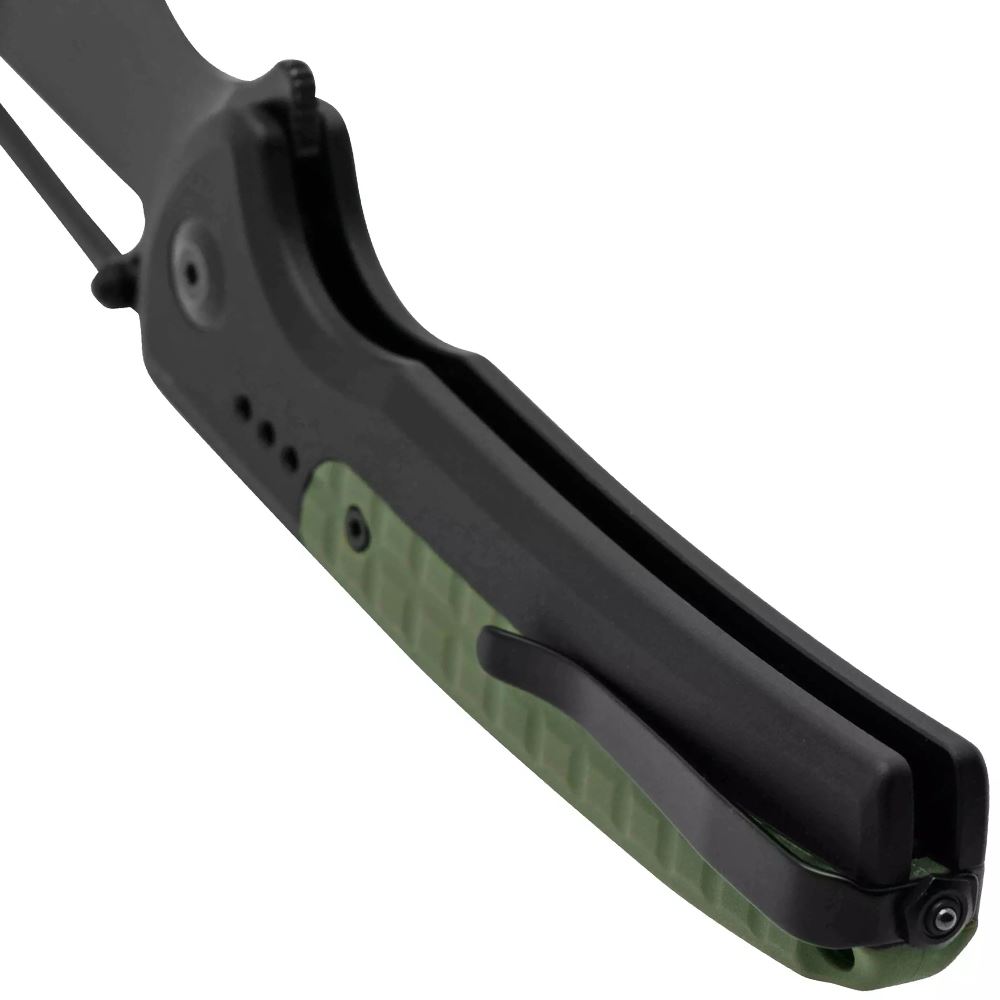 Blending functionality with modern design, the Sentinel Strike stands out as a versatile folding knife for everyday and tactical use. The reverse tanto blade, crafted from premium K110 steel, delivers superior edge retention and a sleek black finish that resists wear. The flat grind ensures clean, precise cuts, while the lightweight aluminum handle, paired with an OD green FRN backspacer, offers both durability and comfort.