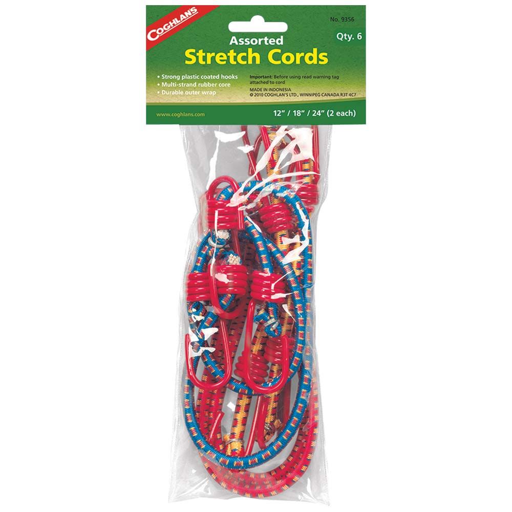 Package of six sturdy high quality stretch cords in three sizes provides an economical assortment for a variety of uses.