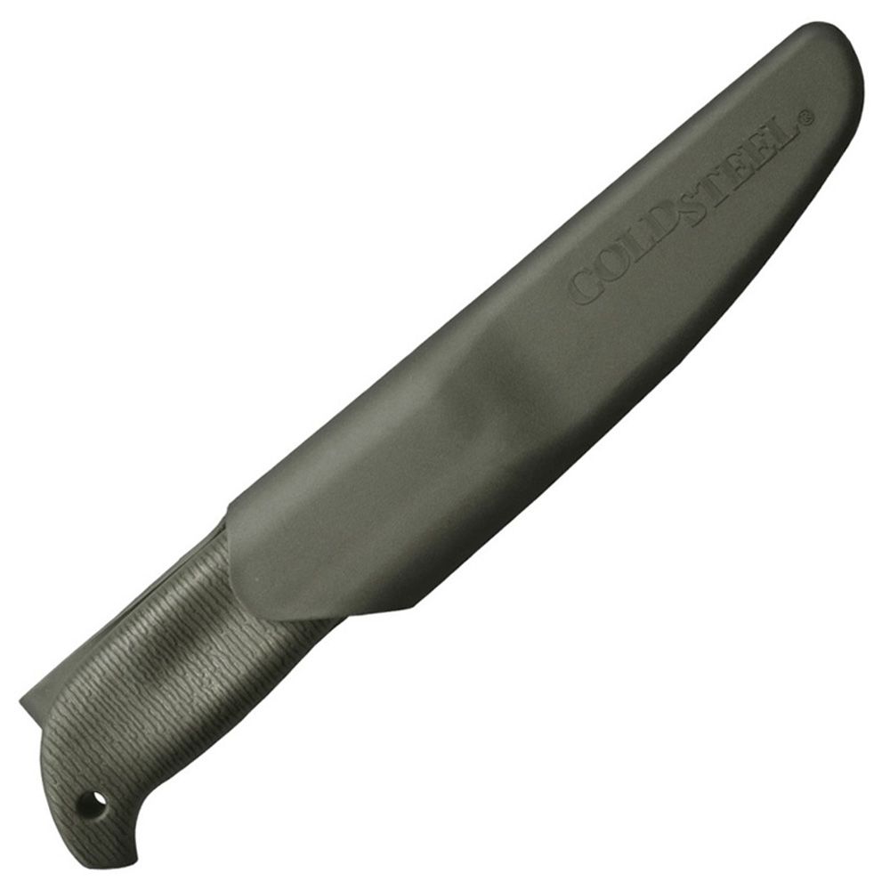 A design collaboration between Andrew Demko and Lynn C. Thompson, the Cold Steel Finn Hawk is the latest in our series of inexpensive hard wearing bushcraft and outdoor tools. Its traditional Nordic styled “Scandi Ground” German 4116 steel blade is sub-zero cryo-quenched for superior edge holding potential, with a steep 7.5mm blade bevel and a functional curving belly for skinning and slicing strokes. Furthermore, its 4” blade is more than big enough for most game processing tasks, not to mention for camp chores and food prep too. The Finn Hawk’s handle is two time injection molded. The first layer of high-impact polypropylene is strong, durable and highly weather resistant, while the outer layer (made of TPR rubber) has a whorled spiral pattern providing a food safe, comfortable and secure grip in even the worst conditions. The Finn Hawk is supplied complete with a slim line secure-ex polymer sheath with integrated belt loop.