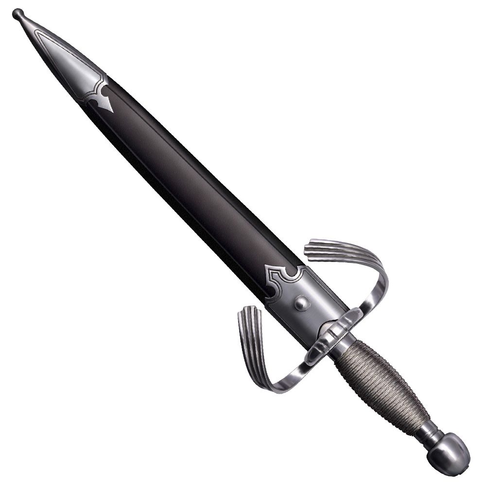 The Cold Steel Large Parrying Dagger has a 13-inch double-edged blade with and up- and out-swept cross guard for catching blades. Includes a leather sheath-wrapped wooden handle.