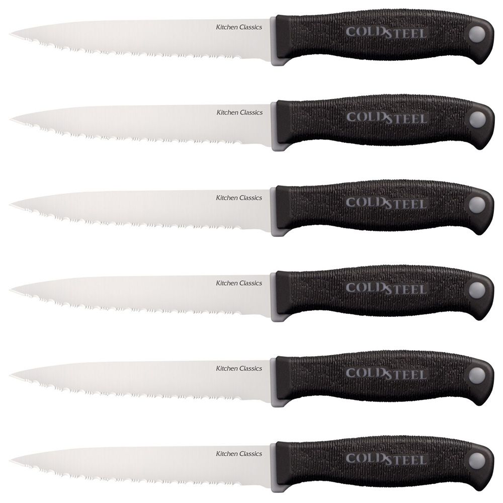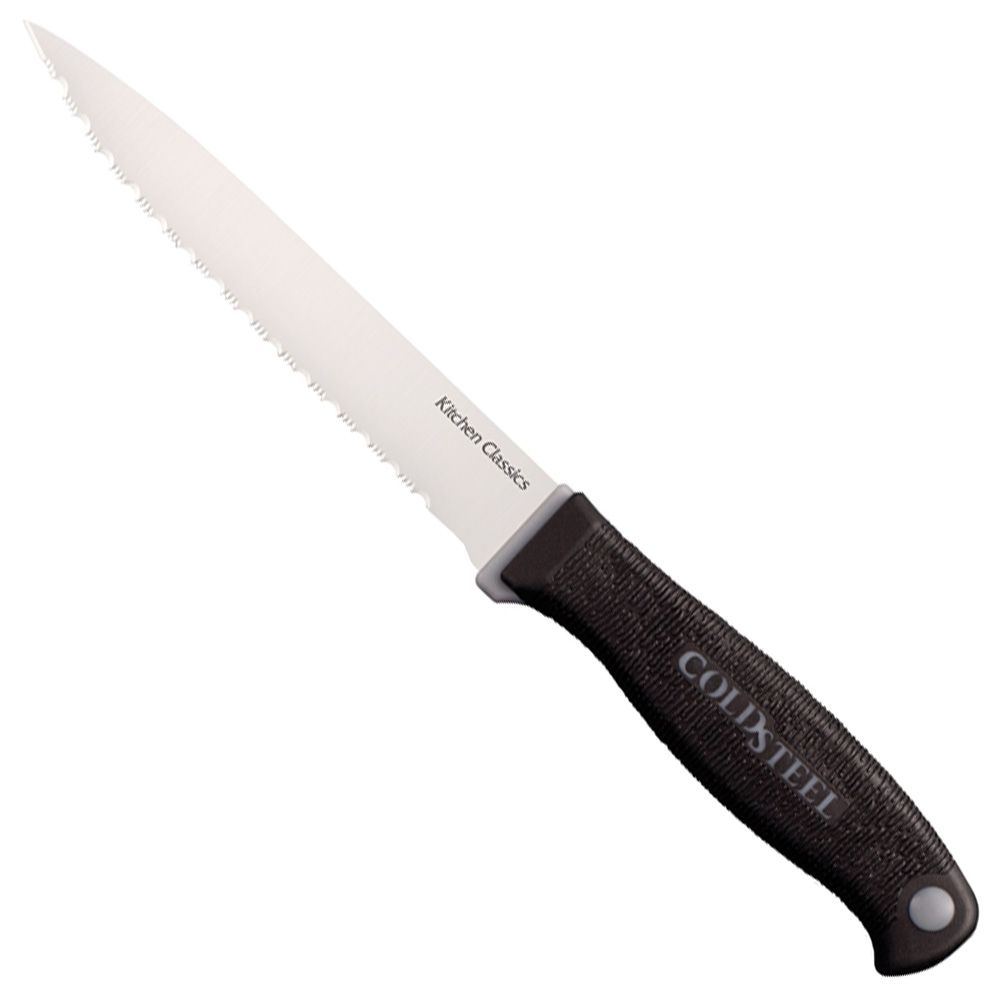 Cold Steel's new series of kitchen knives, the Kitchen Classics, will race through just about any task you can imagine. Theses blades are ice tempered and then precision flat ground for maximum cutting power. All models in the series come with a razor sharp edge that lasts and lasts, and some have serrated edges uniquely appropriate to the tasks they were designed to do. The handles are, in a word, terrific! Carefully designed to ensure a strong, secure, yet comfortable grip, they feature a stiff Zytel® core on the inside, with a softer, deeply checkered rubbery exterior for a the kind of non-slip grip that must be felt to be appreciated!