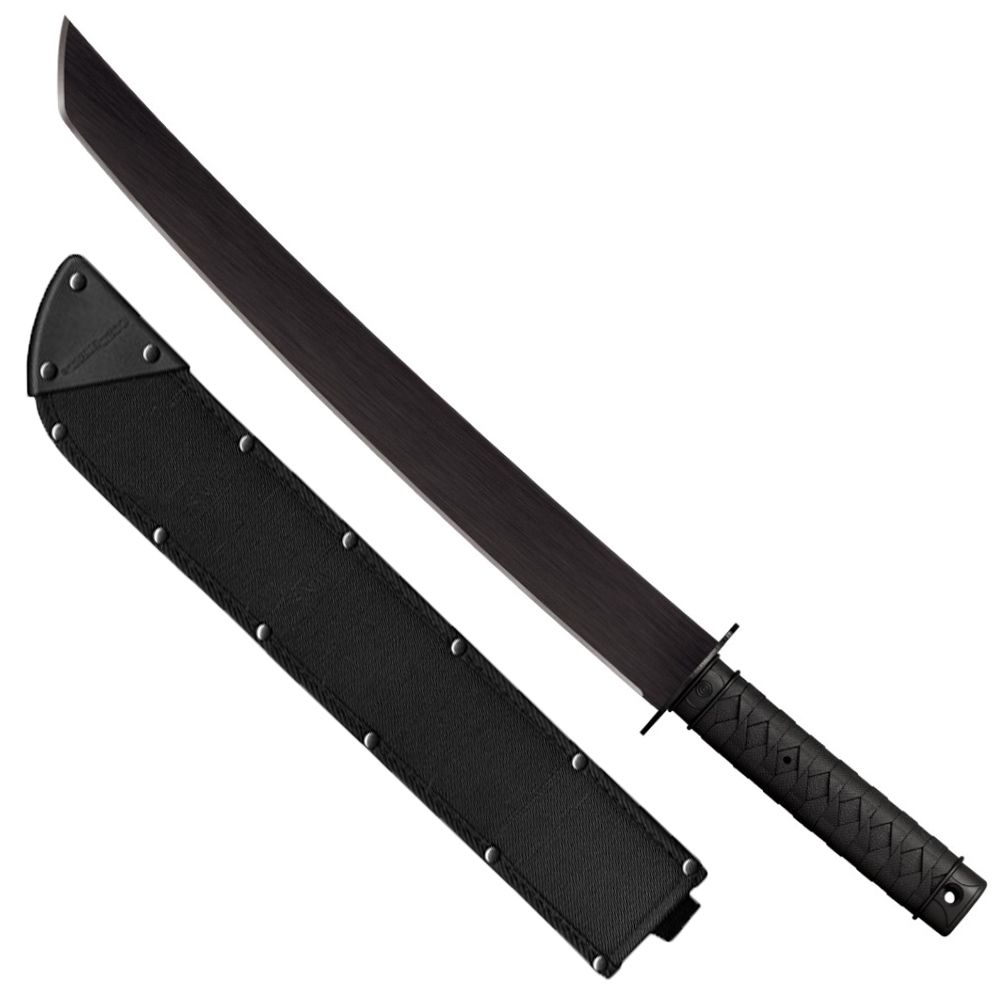 Become a jungle samurai with the Tactical Wakizashi Machete. This sleek fixed blade uses the nimble frame and mid-length reach of a Japanese wakizashi sword, with a bolstered frame designed for brute force tasks. The narrow, even belly slices deftly through branches, vines, and bushes, while the reinforced tip can plunge through any thicket with the strength and precision that only a tanto blade can offer. A polypropylene mold imitates the traditional cord wrapped handle and can fit two hands for powerful swings. A tough cordura sheath is included for storage and carry.