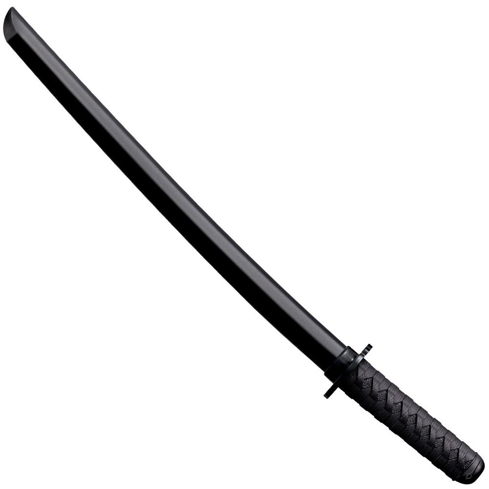 Our improved Cold Steel Japanese Training Swords are closely modeled after the world-famous Warrior series swords. Featuring an intricately detailed imitation cord wrap grip - molded in high impact polypropylene - they offer superior grip and comfort as well as more realistic training potential for the modern Martial Artist. Hundreds of years ago, the Japanese discovered a simple truth; that to become a good swordsman you'll have to practice, a great deal. To become a great swordsman you'll have to practice with a "live blade". And during the period between "good" and "great", you should spend your time building your skills and confidence enough to wield a razor sharp Katana safely and effectively. To accomplish this, the Japanese relied on a simple wooden sword called a "bokken" for much of their training. It was made from the super tough wood of the Japanese White Oak, a wood they called Kashi. The swords produced from this wood had the advantage of replicating the size, weight and feel of a steel sword, while minimizing the possibility of causing grievous or permanent injury to those who used it. Authentic Kashi wood Bokkens are still used today, but are becoming quite costly. They also have the disadvantages, being made of wood, that they may rot, crack split or splinter. Cold Steel's solution to these dilemmas was to design a synthetic substitute, low in price and impervious to the elements. The Wakazashi Bokken is made of the heaviest grade polypropylene available and closely duplicate a real Katana or Wakazashi in length, size, weight and feel. While they're not quite as rigid as wood, they have the advantages of being virtually unbreakable and remarkably stiff and cut resistant.