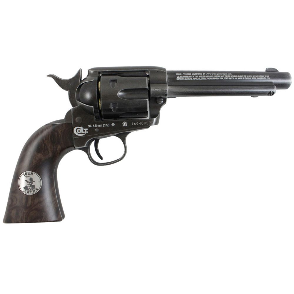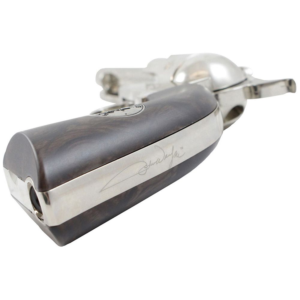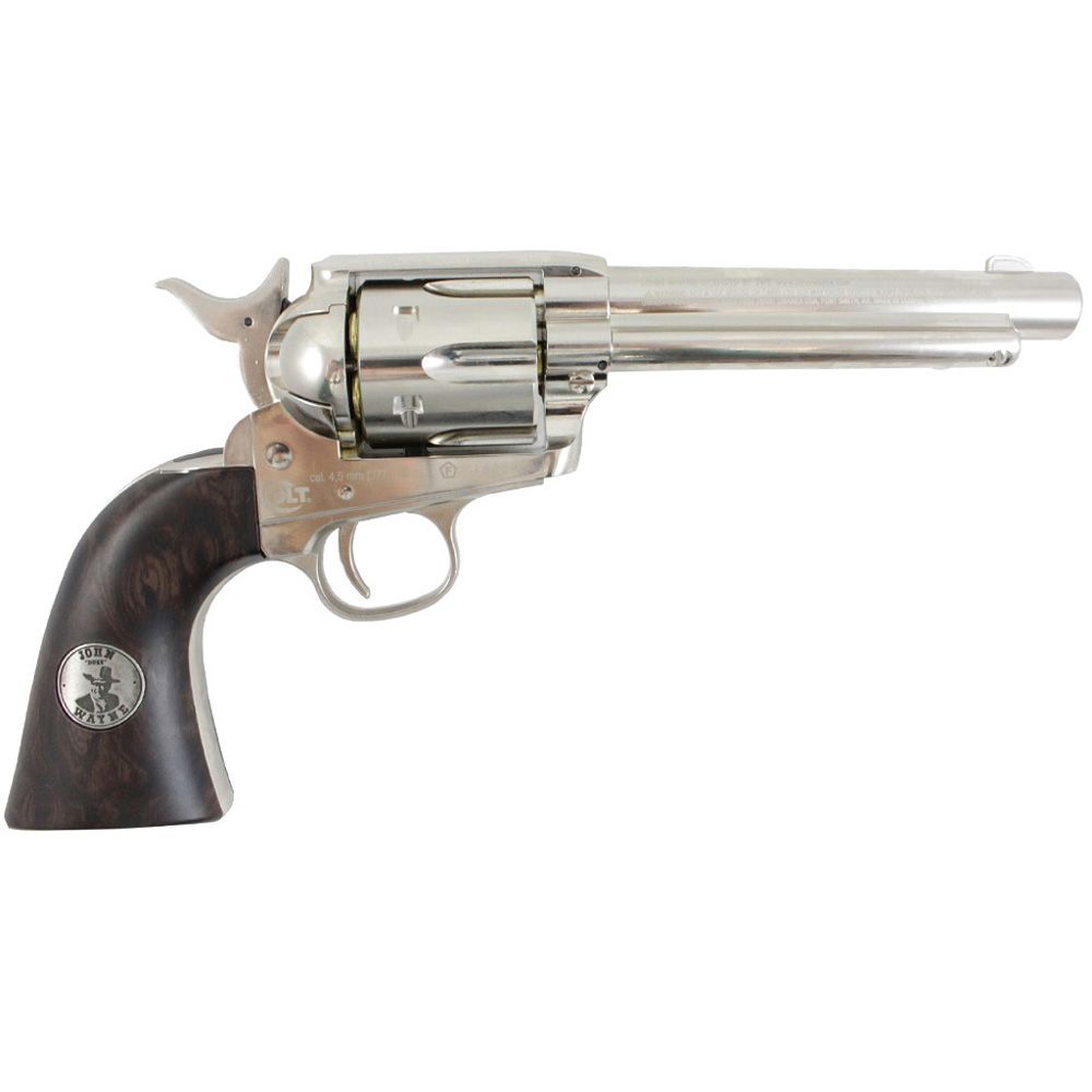 The Duke’s legacy lives on with this western justice Colt SAA BB revolver. Inspired by the legend himself, this Air Venturi 4.5mm air gun is engraved with a John Wayne signature and grip medallion. The full metal construction is available in mirror polished nickel or with a weathered gunmetal finish. Just like a real steel Colt .45, this gun uses a single action system with a functional cylinder and loading gate.