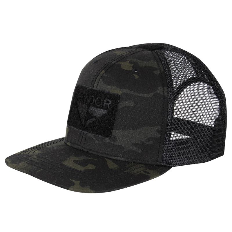 Comfort meets camouflage in the Condor Flat Bill Trucker Adjustable Cap. This tactical hat is available with a genuine Cry Precision multicam or multicam black pattern for effective camouflage across diverse terrain. With a flat bill design, poly/cotton ripstop construction, and mesh backing, this hat offers maximum protection from sight, sun, and heat. A large 2-inch x 3-inch panel on the front, and a smaller 1-inch x 1-inch panel on top have been equipped for patch display.