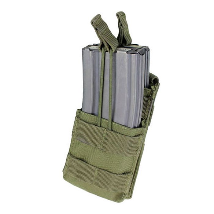 The Condor Quick Access To Magazines Pouch is a tactical accessory designed for efficient ammunition management. It holds two AR/M4 magazines in a compact, open-top design reinforced with elastic bands for secure yet quick access. Compatible with MOLLE systems, it features front webbing for extra gear attachments and measures 5.75"H x 3"W x 2"D, making it durable and functional for military, law enforcement, and tactical enthusiasts.