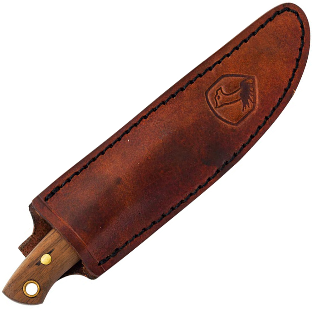 Its full flat grind with a second bevel enhances its cutting precision, while the lightweight construction ensures ease of handling. The handle, made from natural walnut, not only provides a secure grip but also adds a touch of classic elegance to the knife’s design. Complete with a welted leather sheath, this knife is a versatile and visually striking addition to any collection.