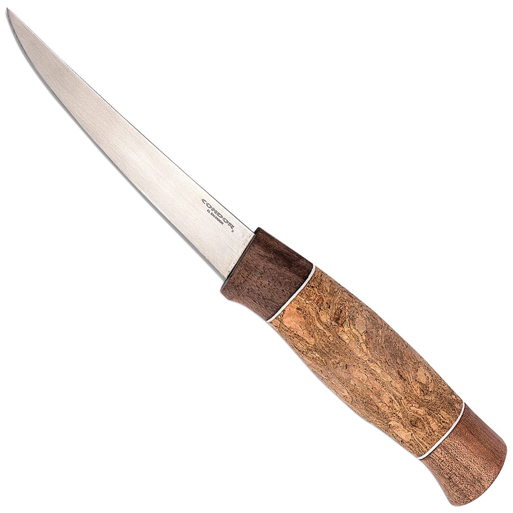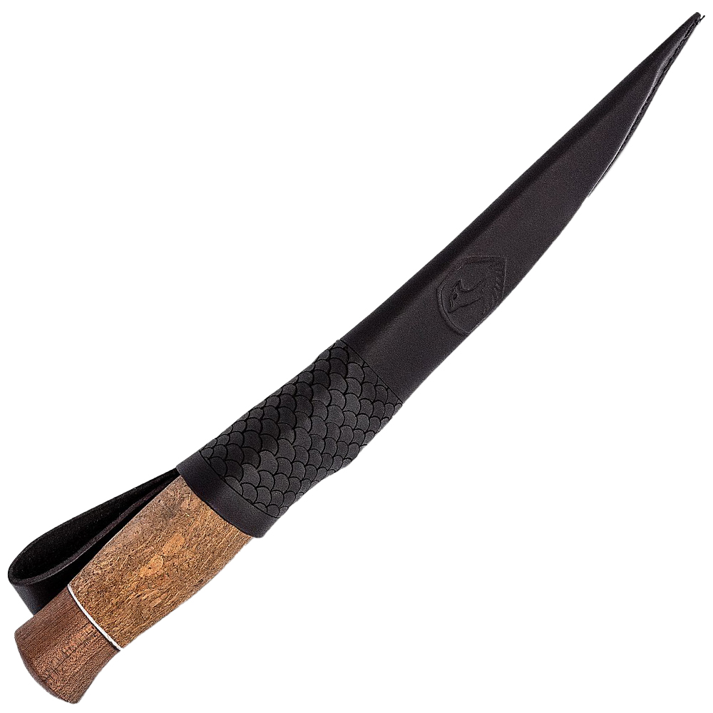 The walnut and cork handle strikes a balance between natural beauty and ergonomic design. Its lightweight construction ensures fatigue-free handling, while the textured surface offers a secure grip in different conditions. This thoughtful design allows the knife to perform comfortably during prolonged use. Accompanied by a hand-crafted welted leather sheath, this knife is not only a reliable tool but also an elegant addition to your gear collection. The sheath provides protection, ease of transport, and a timeless touch that complements the knife’s design.