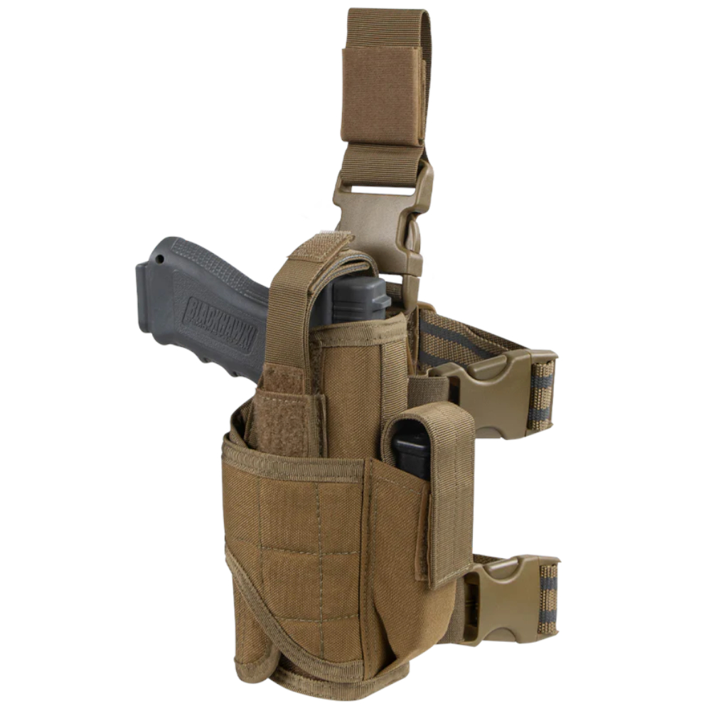 Equip Yourself With The Tornado Tactical Leg Holster, Designed For Tactical Efficiency And Durability. Its Fully Adjustable Wrap-Around Design Fits Medium And Large Pistols, Including Those With Laser Or Flashlight Attachments (Max: 5" Barrel). The Retention System, Enhanced With An Additional Hook-And-Loop Strap, Provides Maximum Security For Your Weapon While Ensuring Rapid Access. With A Non-Slip Adjustable Leg Strap And An Adjustable Pistol Mag Pouch, This Holster Is Built For Comfort And Versatility In Any Environment.