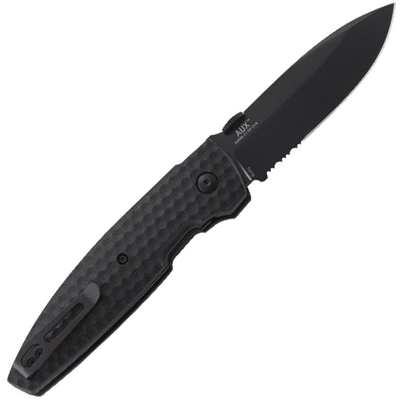 Backup your everyday carry with the Aux Folder. This tactically inspired pocket knife was designed by CRKT mastermind Lucas Burnley to supplement your larger, task-specific tools. The modified blade shape is a cross between a drop point and spear point, with a powerful tip and sharp belly. Available with a satin finished plain edge or black oxide serrated edge to match your preference for clean slicing or burly rough cutting.