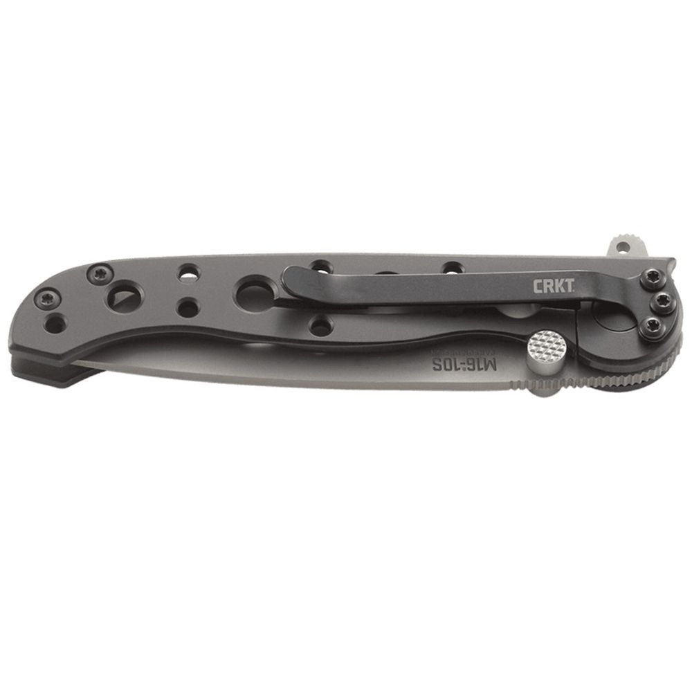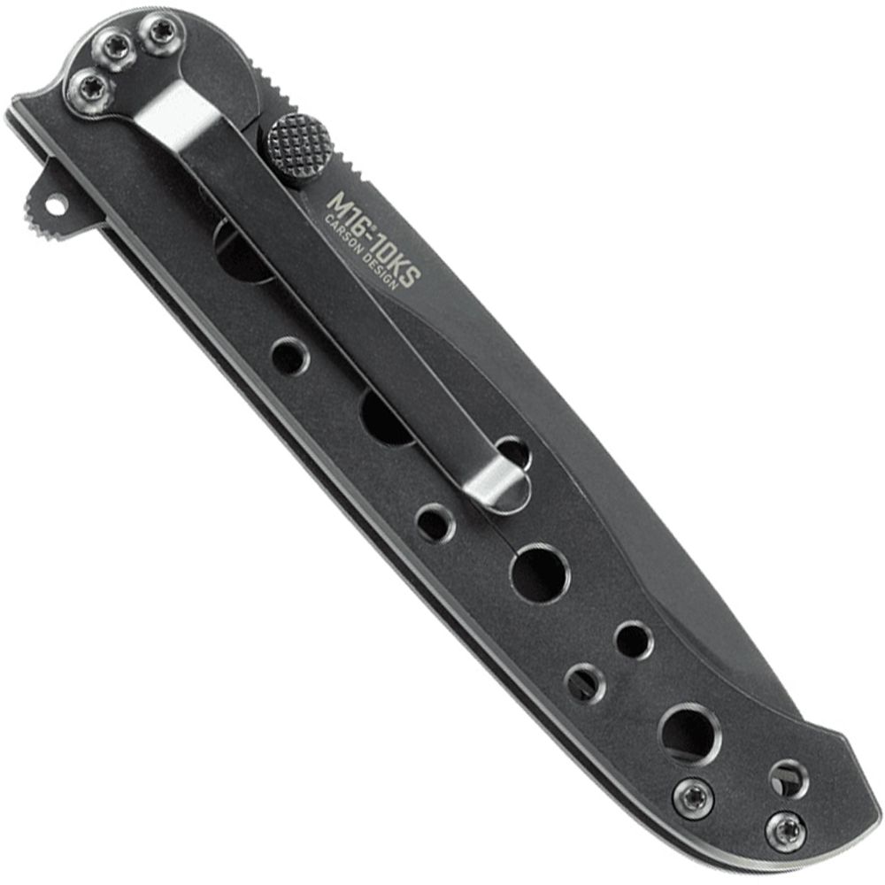 Handles are shaped and contoured in the same confident grip M16 style, but are crafted of a retro flavored stainless steel. Handles are all finished in a classic black oxide finish. These folders are available in several blade style options including cutting edge configurations, each with their own user advantages to offer. Blades also feature the Carson Flipper for quick and convenient blade actuation—and the flipper doubles as an effective blade guard in the open position. Blade lock up is secured through the traditional framelock mechanism.