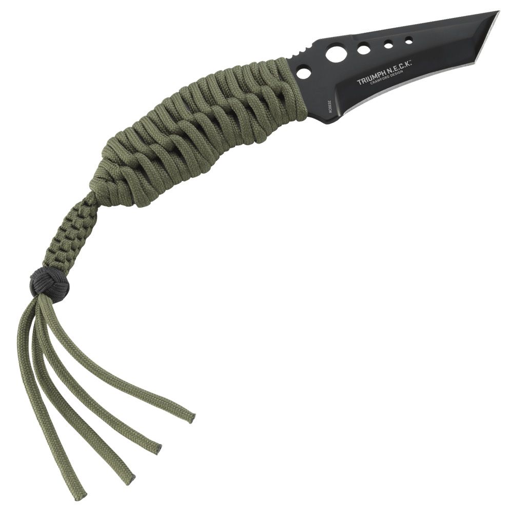 The Triumph N.E.C.K. Cord Wrapped model is based on the same beefy 0.14" thick blade used on the Triumph Folder. In this case it is a full-tang skeletonized design, with recurved dual-grind Tanto to aid cutting and a false top edge grind for penetrating power. We offer two different knife/carry systems.