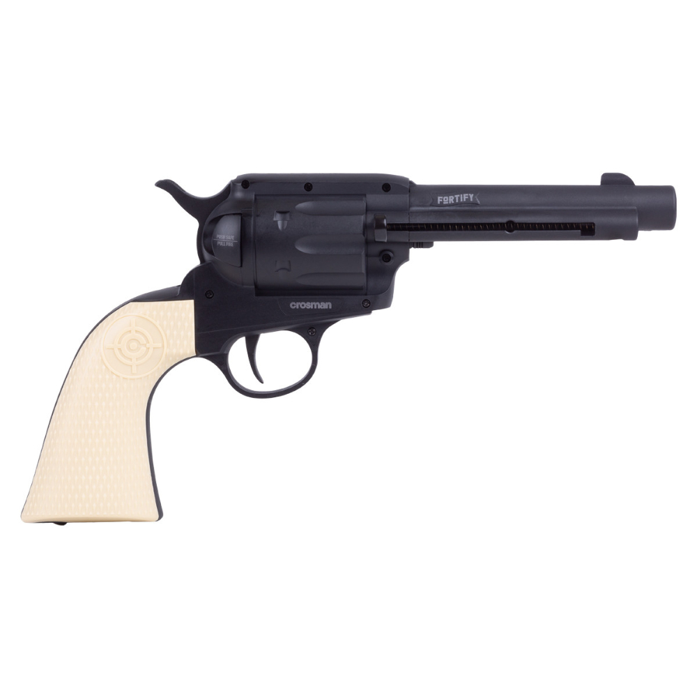 Those tin cans and spinning targets have been taunting you from the backyard. Take matters into your own hands with the new Fortify air pistol! The Fortify features a classic revolver look with black and white color styling. This pistol is spring-fed for easy loading and higher shot counts, it holds 18 rounds and features a functional hammer. The Fortify is powered by CO2 and shoots BBs up to a blistering 420 fps.