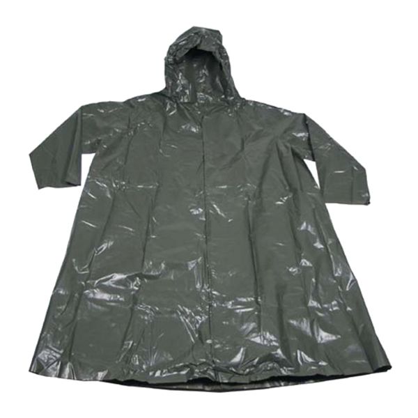 An authentic Czech vinyl Poncho in Olive Drab. The thin light weight material in partnership with the carrying bag makes this poncho perfect to keep with you in case of getting caught in the rain. This Poncho is very long, and will cover down to the knees of the average person