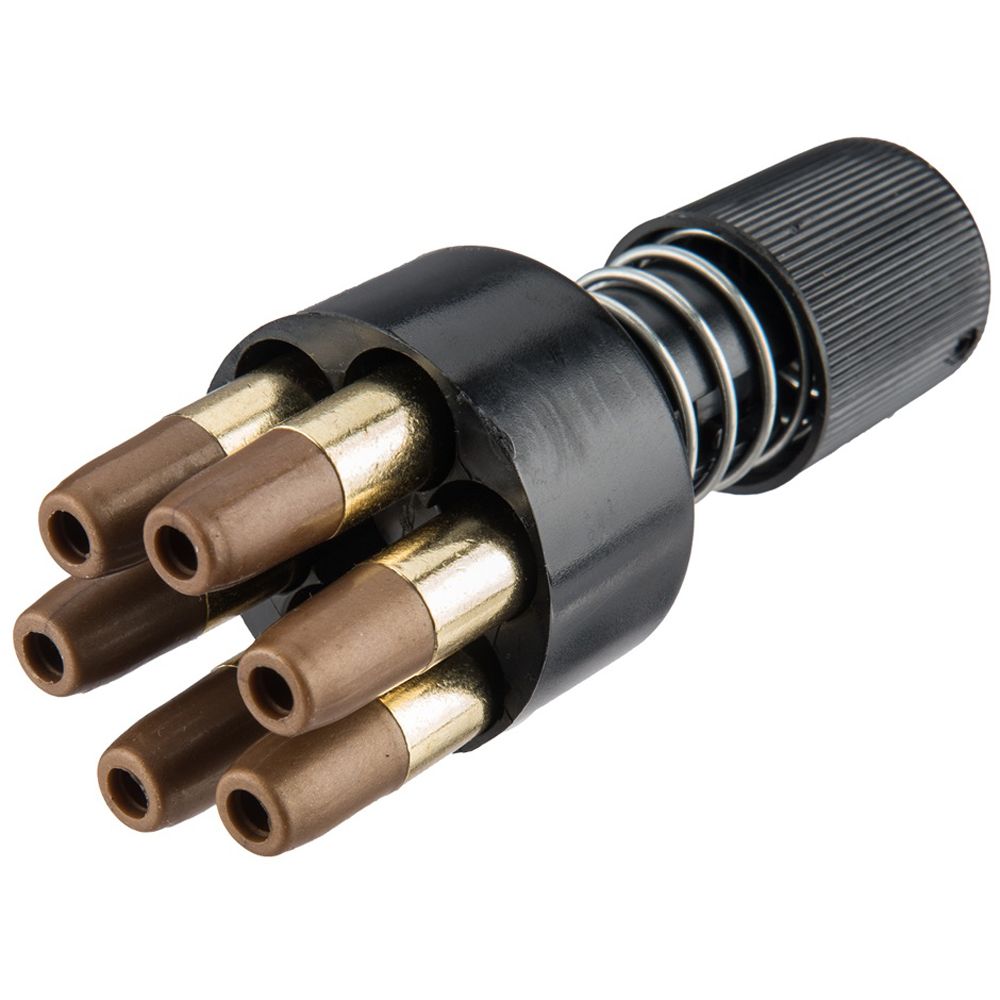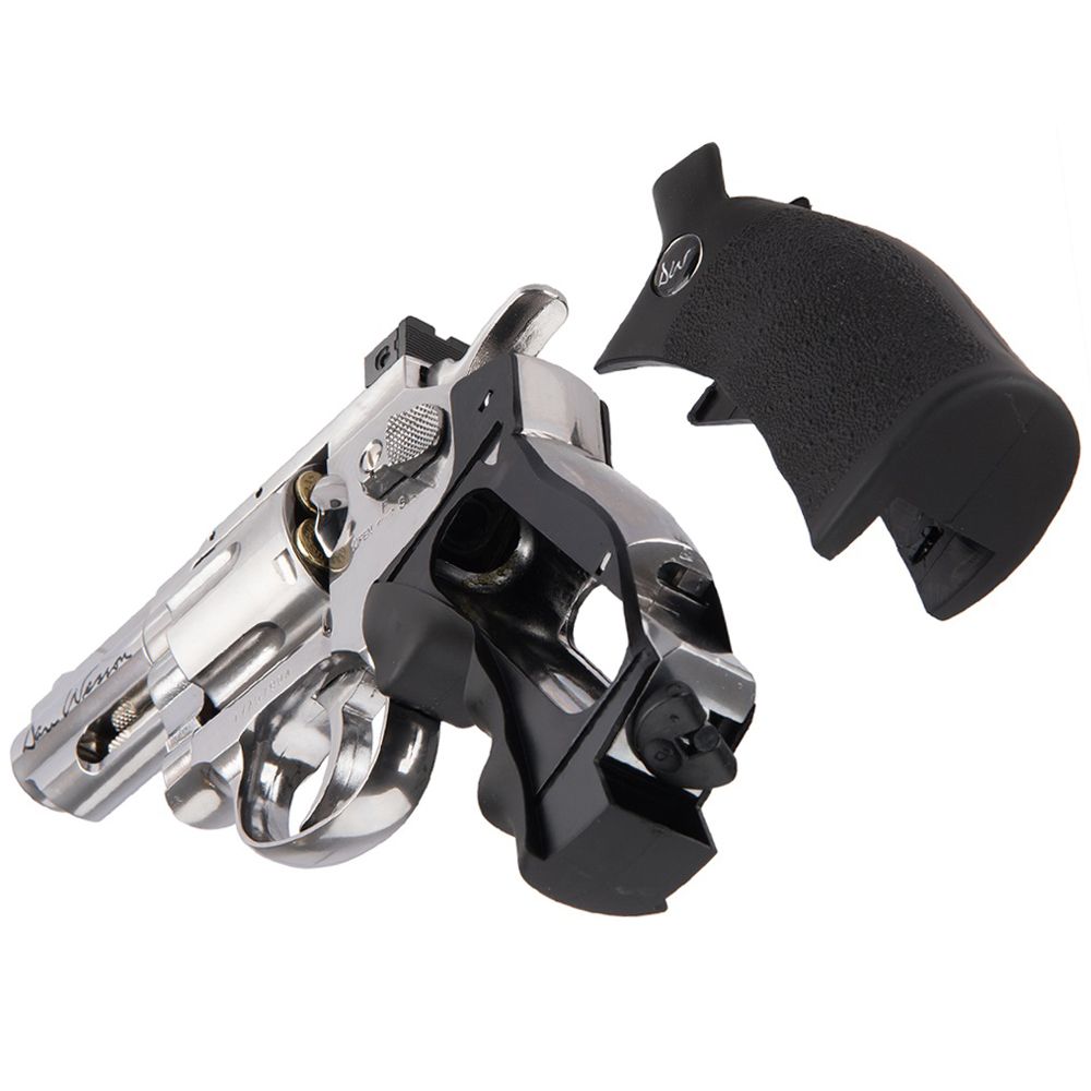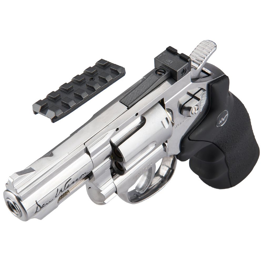 This chrome BB revolver licensed by Dan Wesson, offers realistic shooting fun with a compact 2.5" barrel. It has authentic markings and a individual serial number stamped into the frame. The revolver features a double action trigger system and adjustable rear sight for extra realism and accuracy. The Dan Wesson revolver is made entirely of metal except for the ergonomic grip constructed in hard ABS plastic. The 12g CO2 cartridge is stored in the grip and is easily accessed by sliding the grip back. Each of the 6 cartridges holds one 4.5mm BB and is placed in the metal cylinder that rotates as each round is fired. The package includes a speed-loader and an attachable accessory rail.