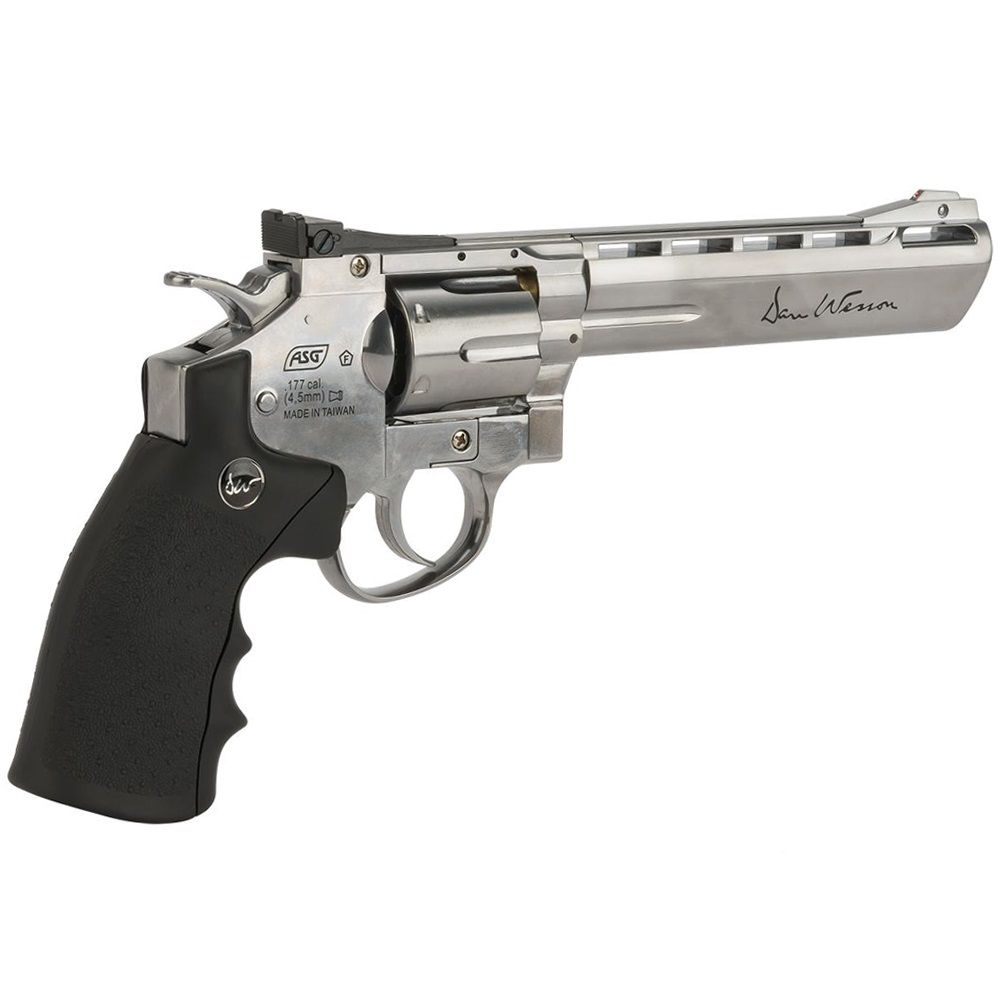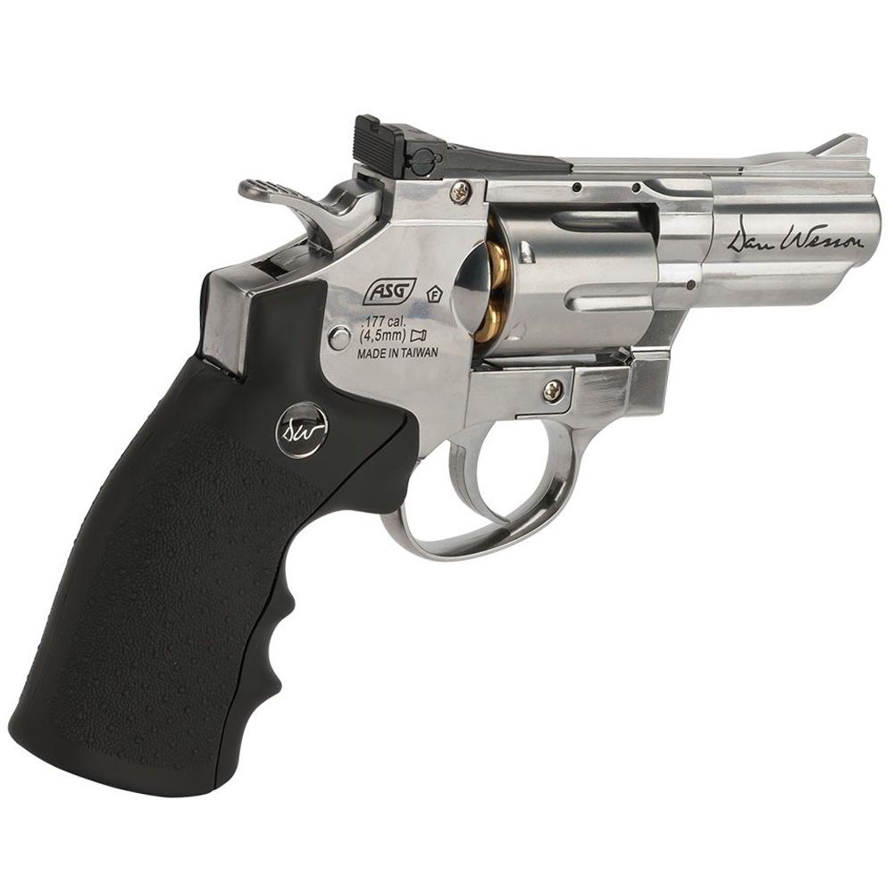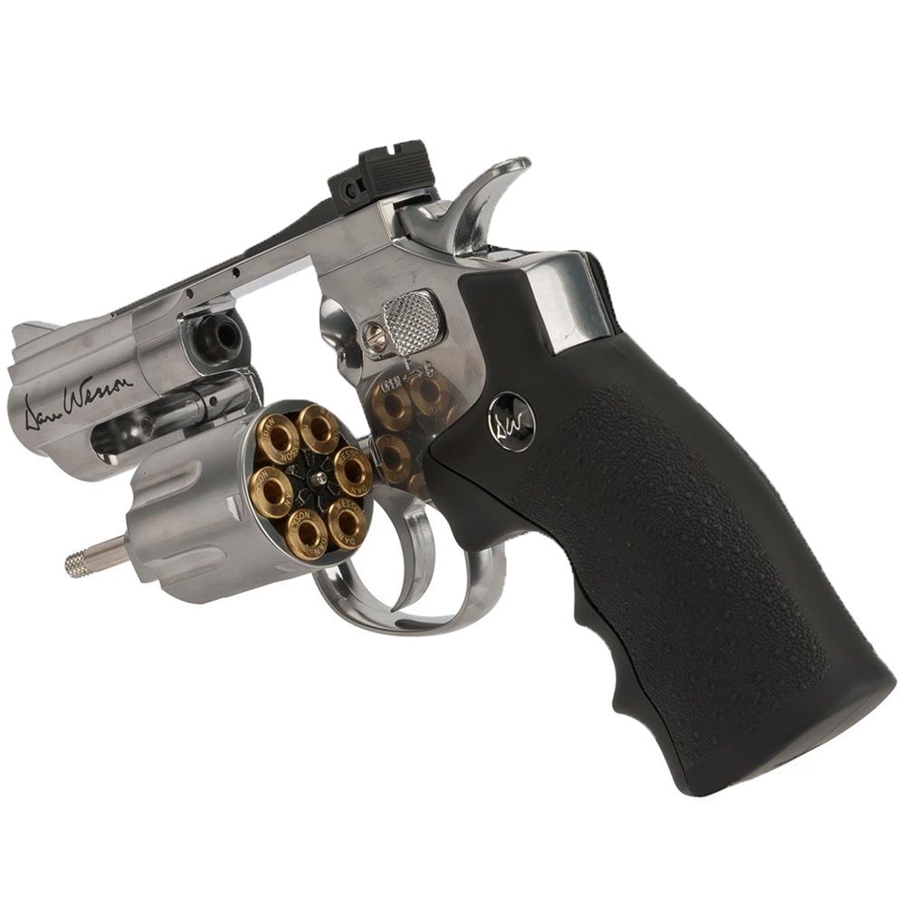This 2.5” silver plated revolver licensed by Dan Wesson, offers realistic shooting fun in a handy size. It is one of a new generation of Dan Wesson airguns with a rifled inner barrel allowing the use of pellets; this improves both range and precision. It has authentic markings and an individual serial number stamped into the frame. The revolver features a double action trigger system and adjustable rear sight for extra realism and accuracy. The Dan Wesson revolver is made of metal except for the ergonomic grip constructed in hard ABS plastic. The 12g CO2 cartridge is stored in the grip and is easily accessed by sliding the grip back – easy-load style. Each of the 6 cartridges holds one 4.5mm pellet and is placed in the metal cylinder that rotates as each round is fired. The revolver comes with speed-loader, attachable rail for optics and 6 heavy-duty all metal cartridges.